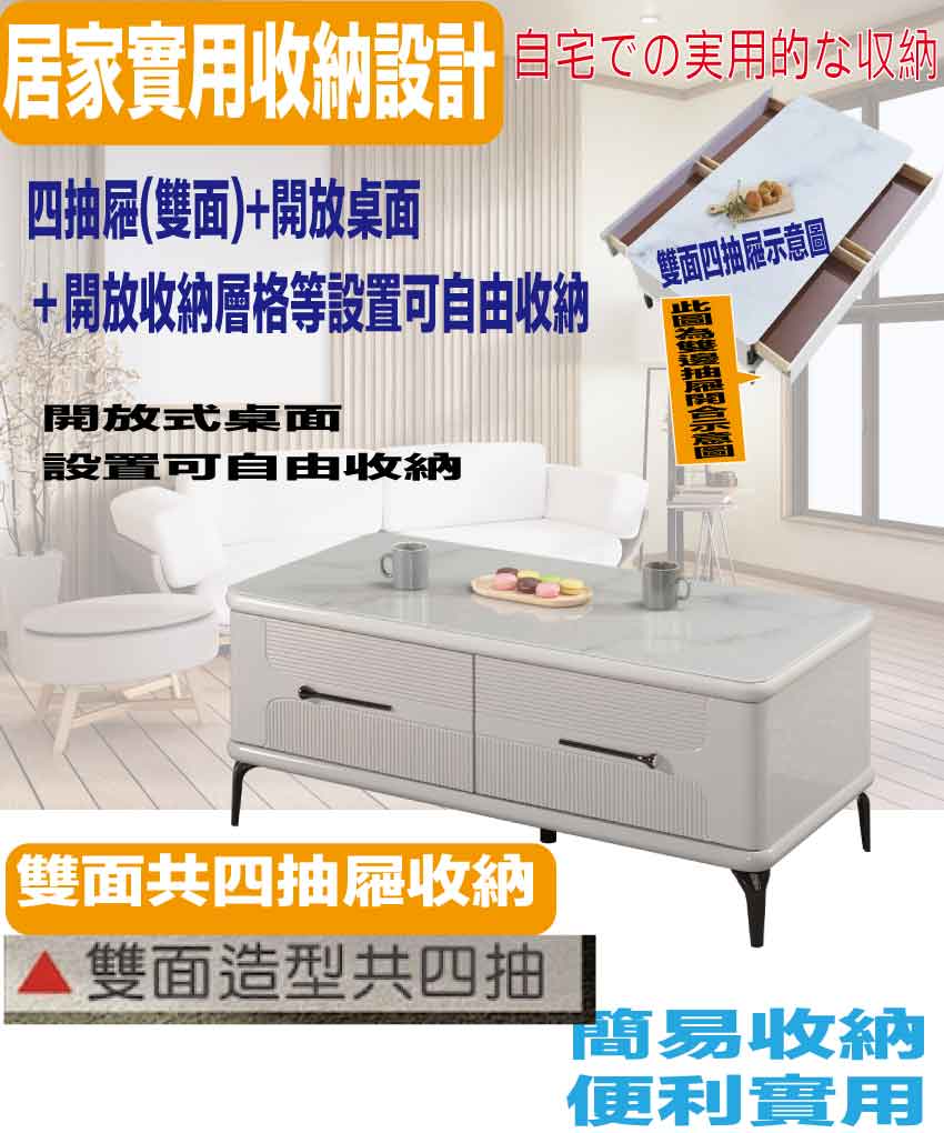 搭配採用雙面開合共四抽屜+開放桌面等收納空間設計