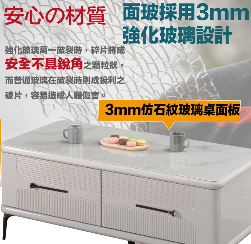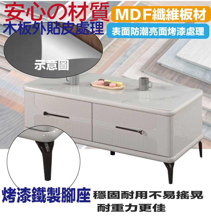 採用防潮MDF板+烤漆鐵製腳座+五金滑軌結構+3mm仿大理石紋玻璃桌面板等安心材質製造