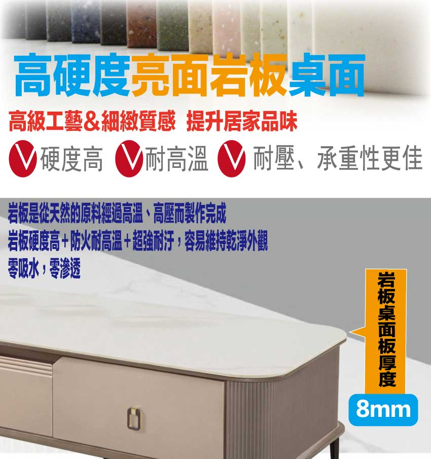 採用防潮MDF板+烤漆鐵製腳座+五金滑軌結構+8mm高硬度岩板桌面板等安心材質製造