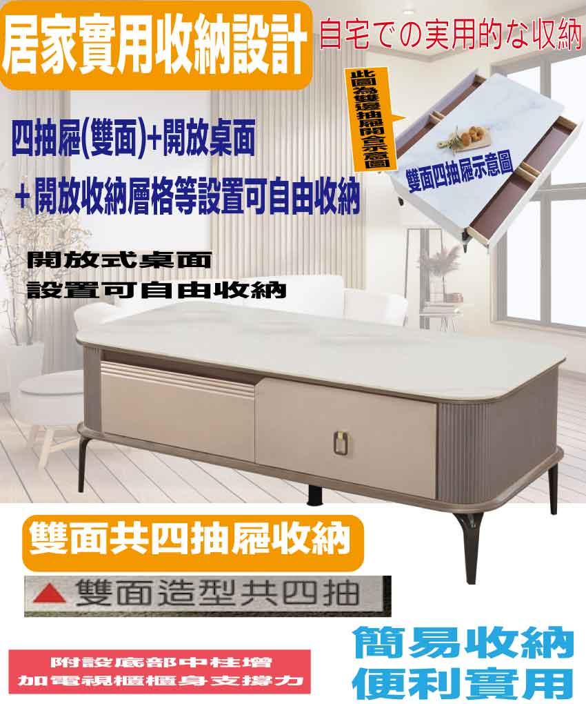 搭配採用雙面開合共四抽屜+開放桌面等收納空間設計