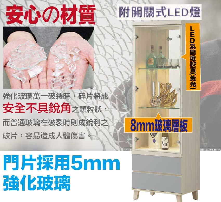 採用防蛀木心板+防刮實木腳座+五金滑軌結構+防夾手緩衝門片五金+5mm強化玻璃門片+8mm強化玻璃層板+內置LED氛圍燈等安心材質製造