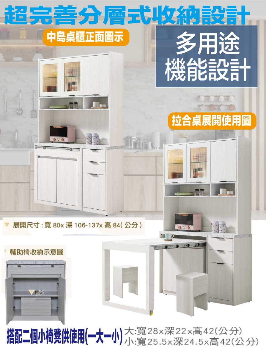 中島桌展開尺寸:寬80x 深106~137x 高84(公分)