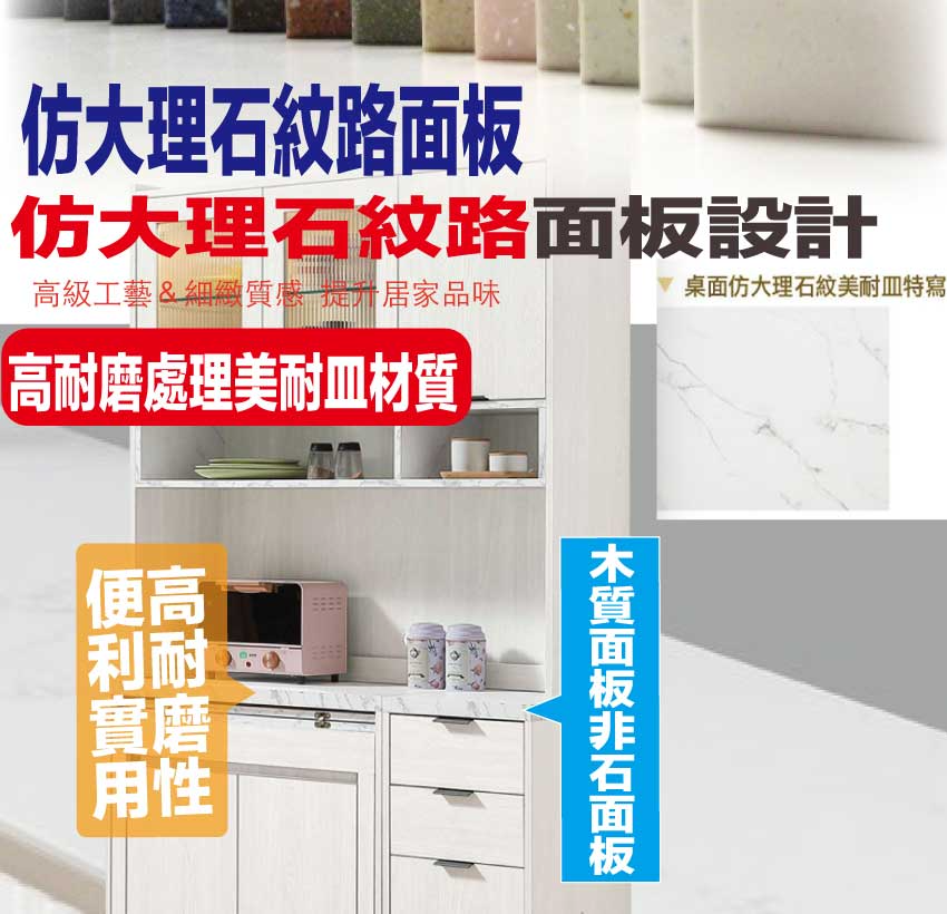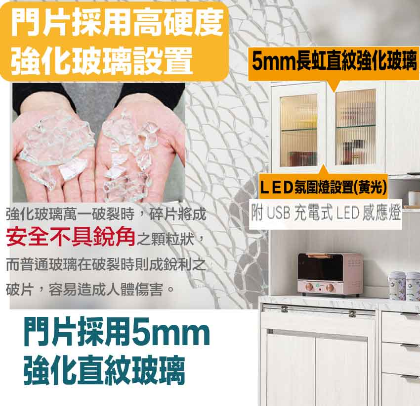 採用防蛀木心板+防潮耐磨底座+五金滑軌結構+仿大理石紋耐磨美耐皿桌面板+長虹直紋玻璃+LED氛圍燈+防夾手緩衝門片五金等安心材質製造
