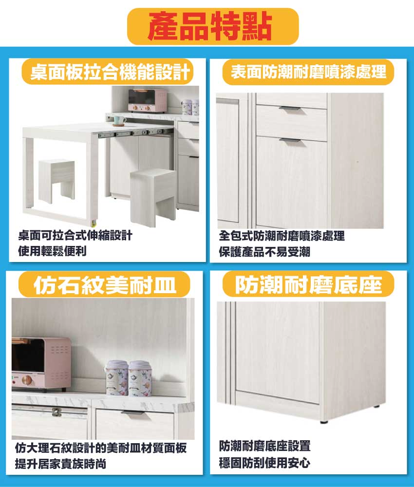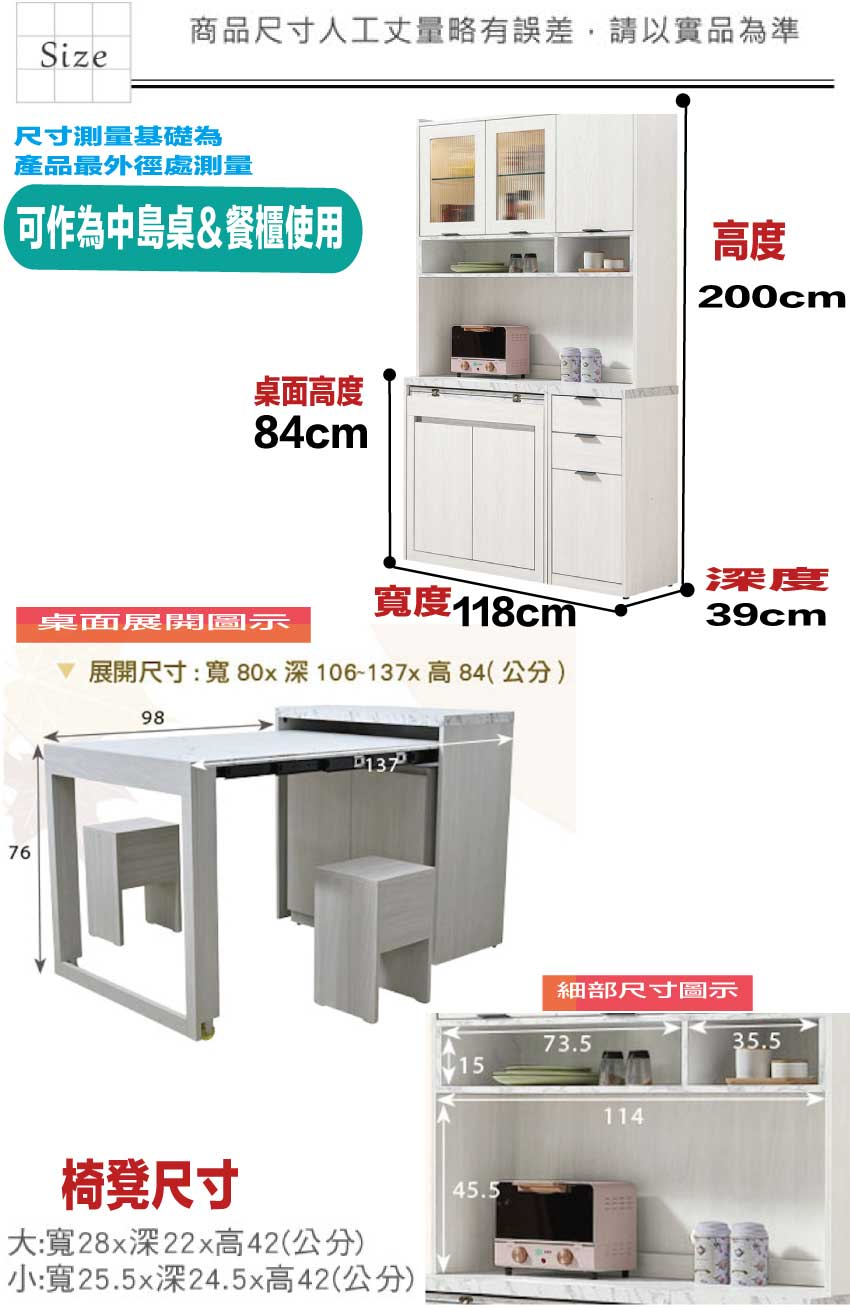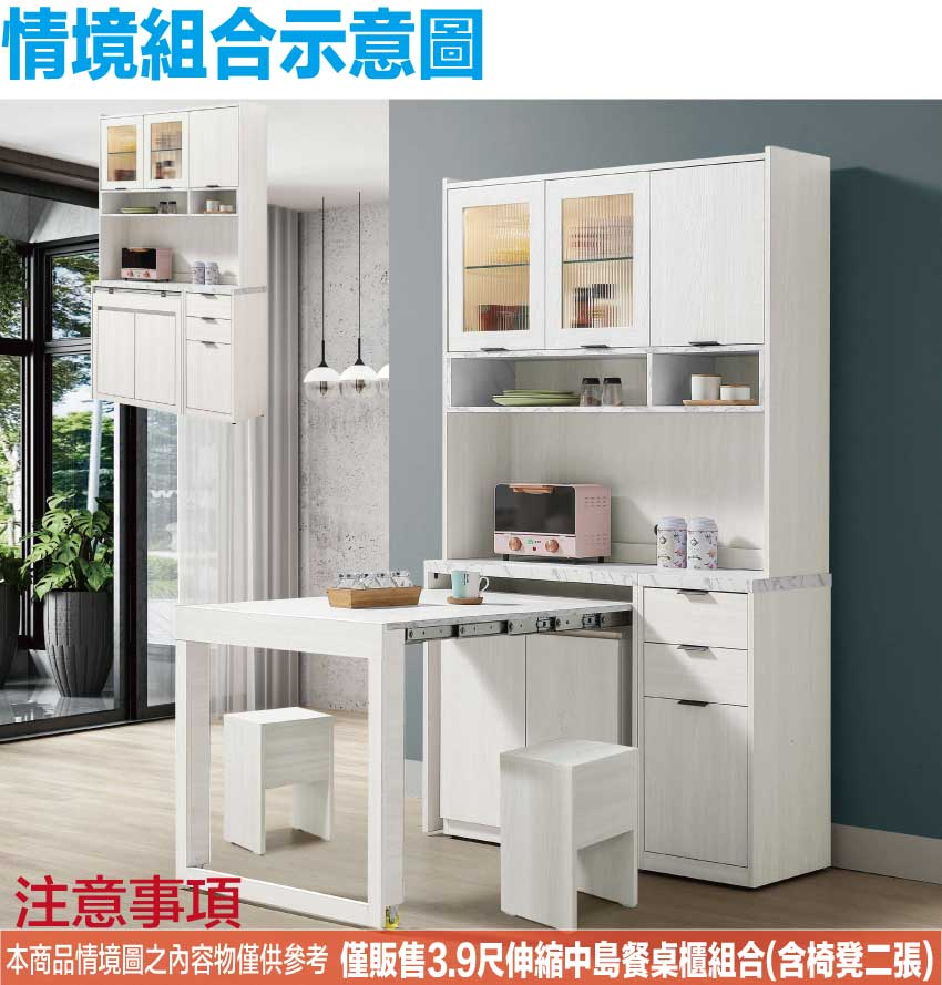 - ◆產品名稱:【綠家居】克卡利雙色3.9尺可伸縮中島桌高餐櫃組合(附二張椅凳+桌面板可拉合使用)