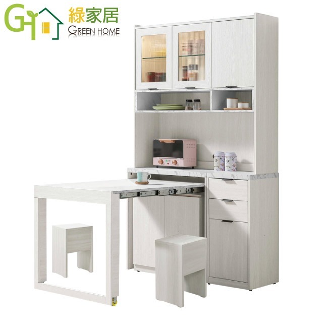 【綠家居】克卡利雙色3.9尺可伸縮中島桌高餐櫃組合(附二張椅凳+桌面板可拉合使用) 現代雙色系+安心材質製造,使用放心+搭配居家更便利,採用防蛀木心板+防潮耐磨底座+五金滑軌結構+仿大理石紋耐磨美耐皿桌面板+長虹直紋玻璃+LED氛圍燈+防夾手緩衝門片五金等安心材質製造 ,外層採用防潮耐磨噴漆處理搭配開門櫃+三抽屜+內&外開放層格等收納空間設計,全由專人配送到家,專業安心服務,替你省下更多時間!