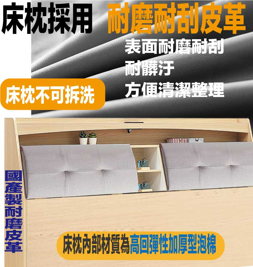 材質:防蛀木心板+六分木床板+防潮耐磨底座+耐磨耐刮皮革+高彈力泡棉
