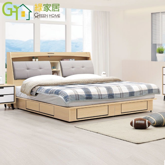 【綠家居】亞卡利5尺雙人耐刮皮革六抽床台組合(床頭+六抽床底+不含床墊) 橡木紋色系+安心材質製造,使用放心+搭配居家更便利,採用防蛀木心板+防潮耐磨底座+六分木床底+耐磨耐刮皮革+高彈力泡棉等安心材質製造 ,外層採用防潮耐磨噴漆處理搭配床頭可掀式床枕板+內&外開放層格+便利插座設置加床底座三邊開合六抽屜等收納空間設計,全由專人配送到家,專業安心服務,替你省下更多時間!