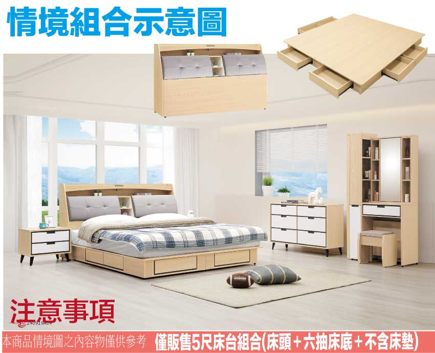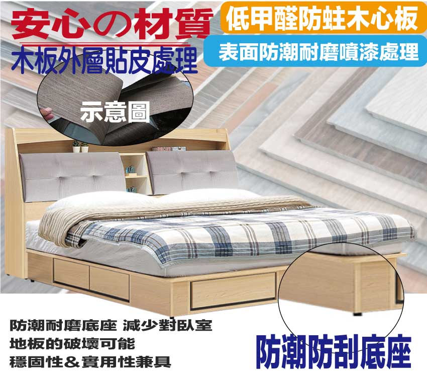 搭配床頭可掀式床枕板+內&外開放層格+便利插座設置加床底座三邊開合六抽屜等收納空間設計