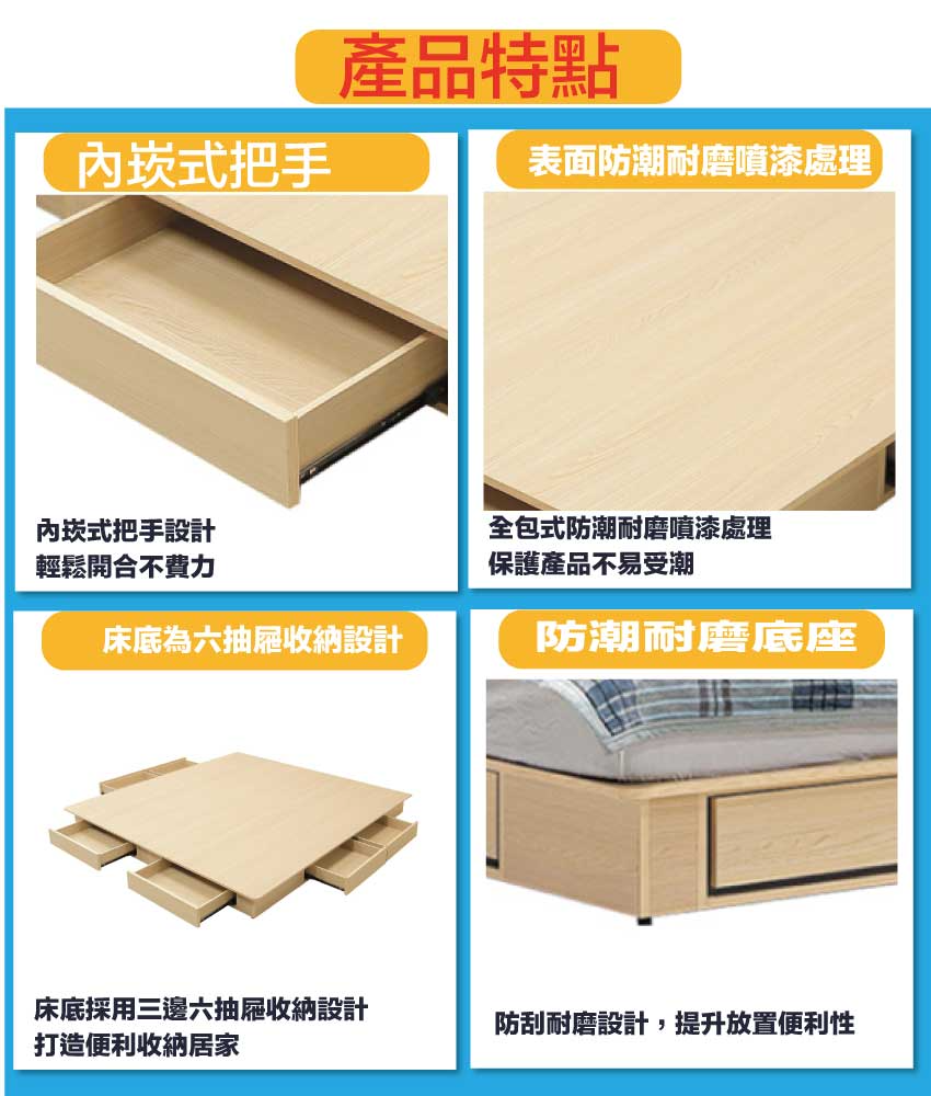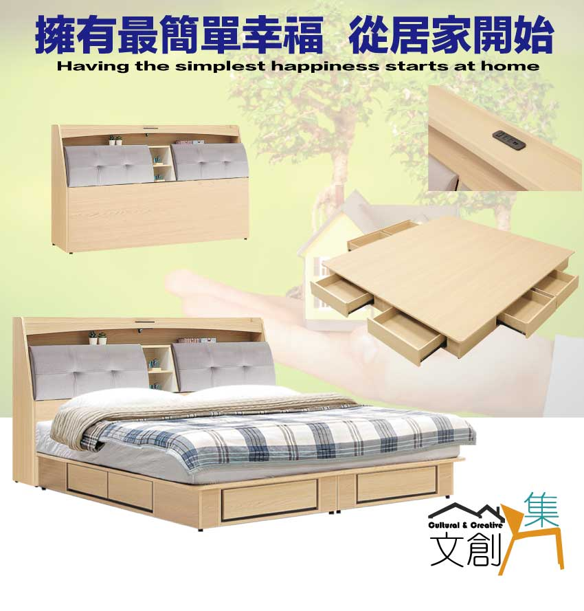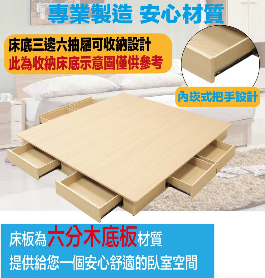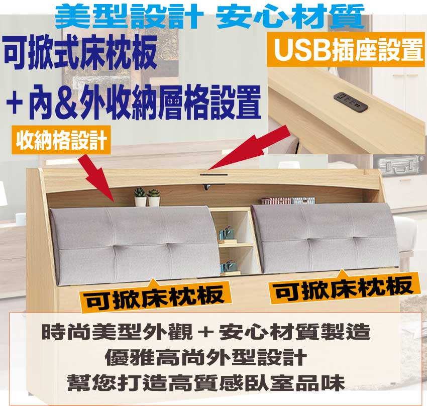 搭配床頭可掀式床枕板+內&外開放層格+便利插座設置加床底座三邊開合六抽屜等收納空間設計