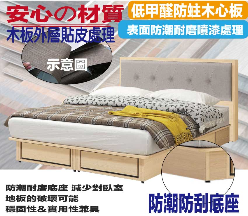材質:防蛀木心板+六分木床板+防潮耐磨底座+耐磨耐刮皮革+高彈力泡棉