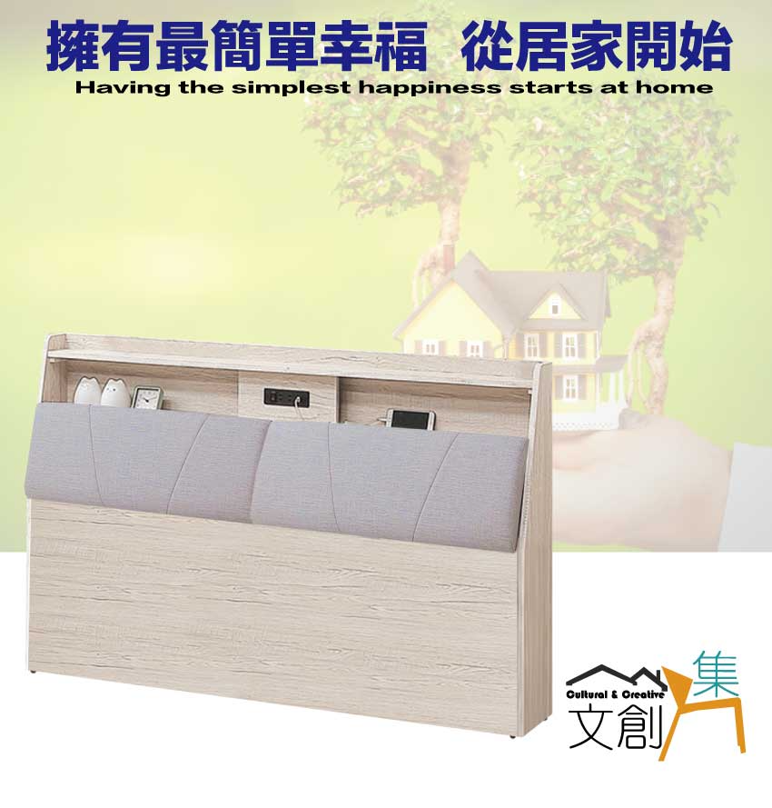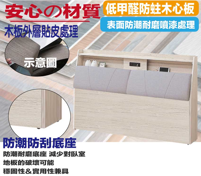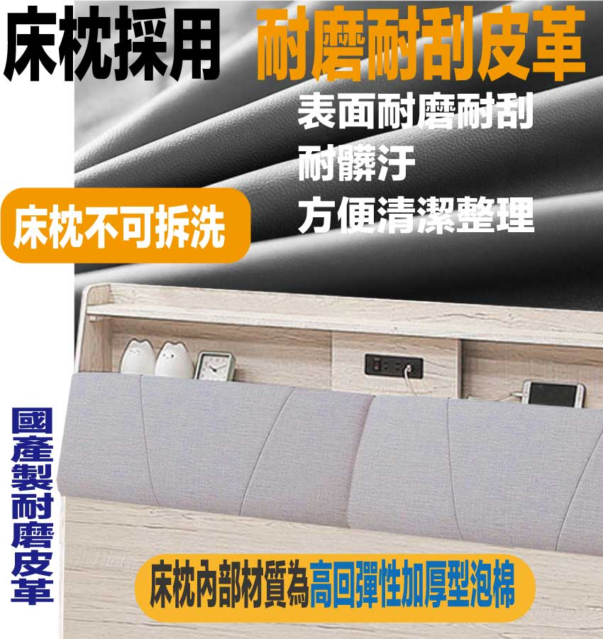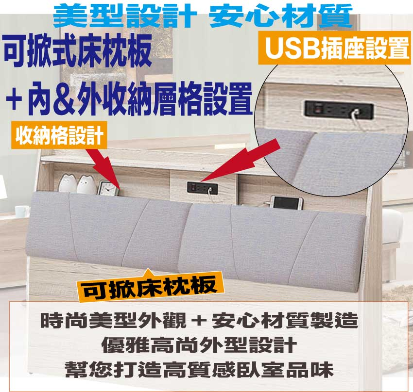 搭配床頭可掀式床枕板+內&外開放層格+便利插座設置等收納空間設計