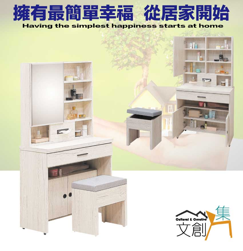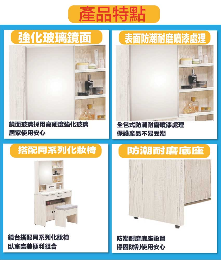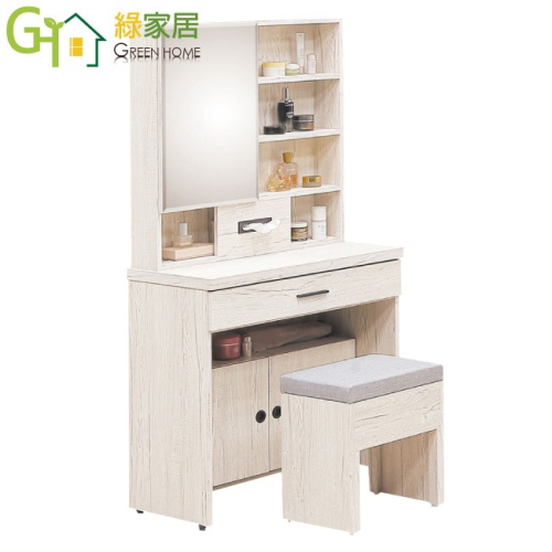 【綠家居】得卡利2.7尺開合鏡面鏡台/化妝台組合(含化妝椅) 淺橡木紋色系+安心材質製造,使用放心+搭配居家更便利,採用防蛀木心板+五金滑軌結構+強化玻璃鏡面+防潮耐磨底座等安心材質製造 ,外層採用防潮耐磨噴漆處理搭配採用開合鏡面櫃+開門櫃+單抽屜+內&外開放層格等收納空間設計,全由專人配送到家,專業安心服務,替你省下更多時間!