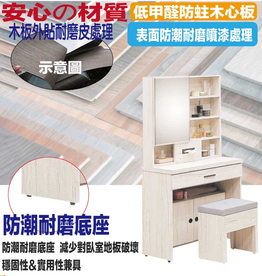 採用防蛀木心板+五金滑軌結構+強化玻璃鏡面+防潮耐磨底座等安心材質製造