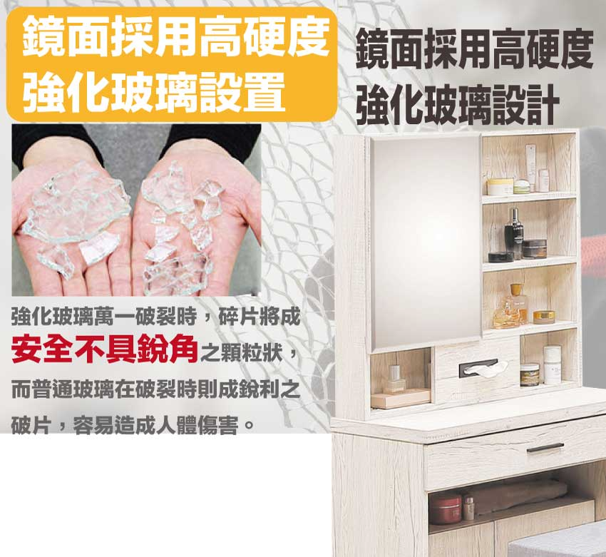 材質:防蛀木心板+五金滑軌結構+強化玻璃鏡面+防潮耐磨底座