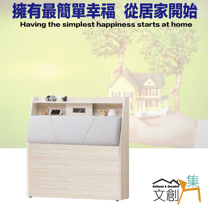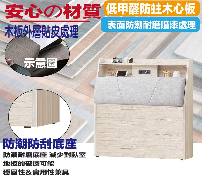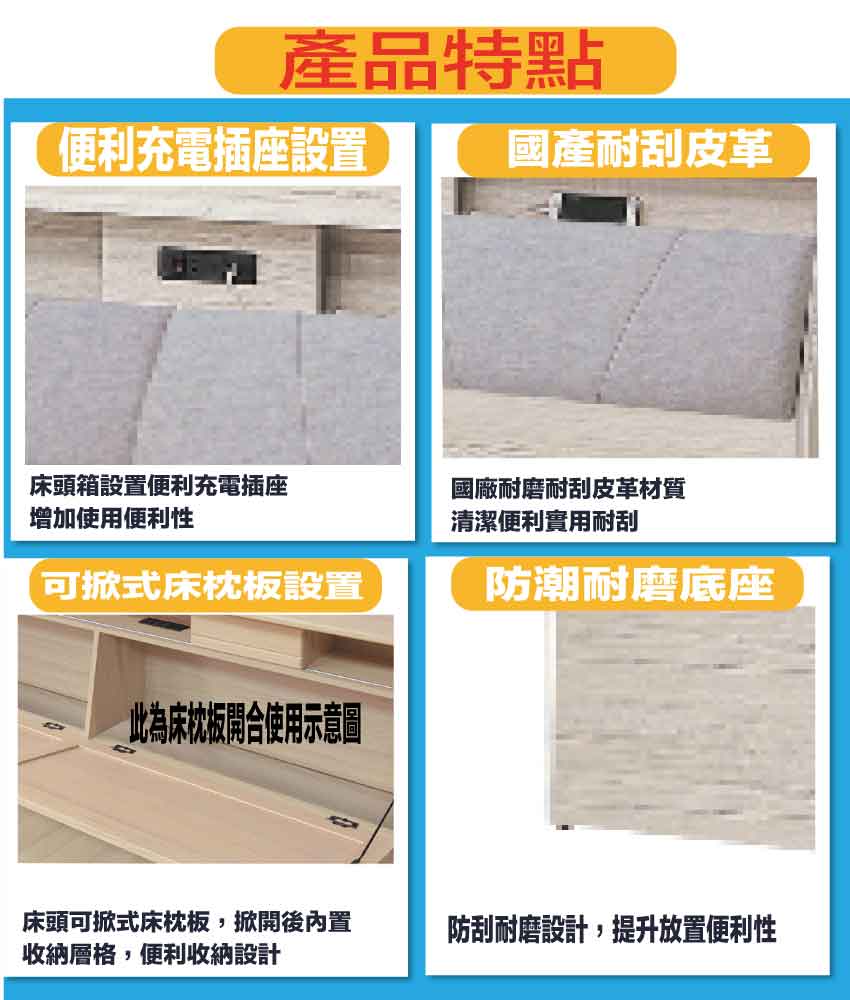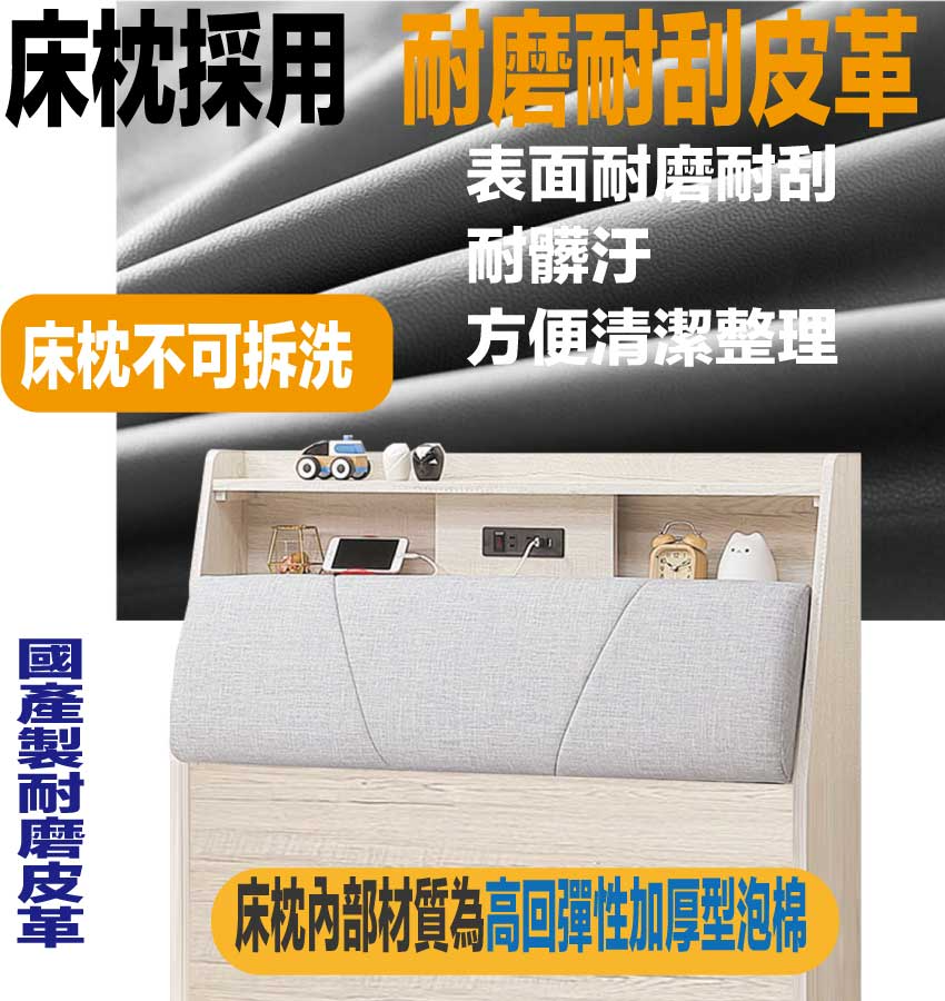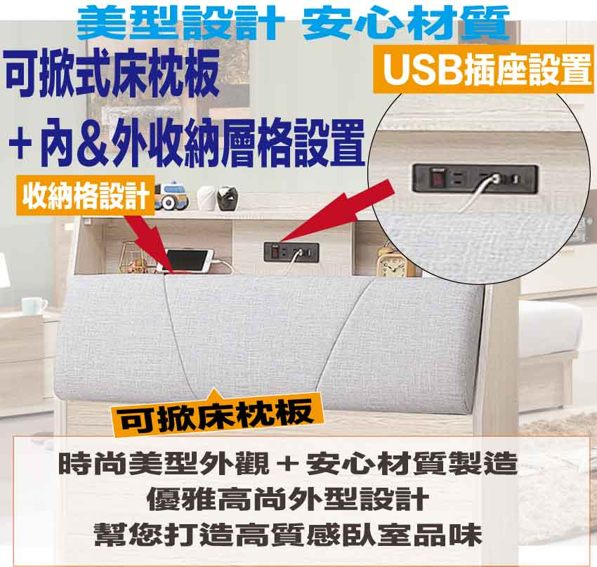 搭配床頭可掀式床枕板+內&外開放層格+便利插座設置等收納空間設計
