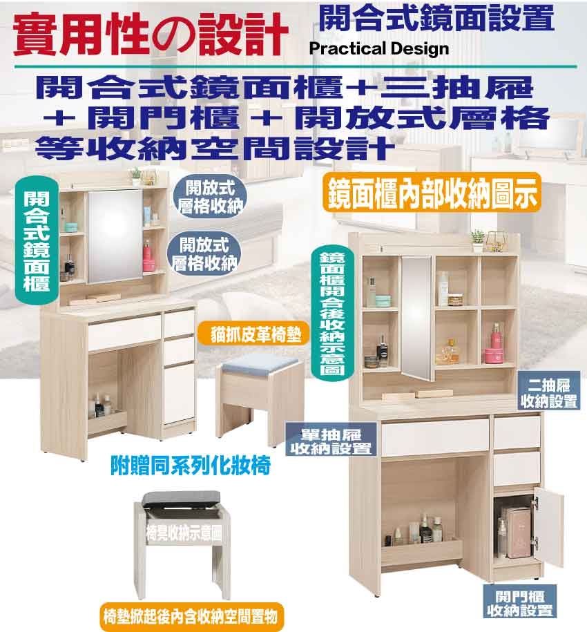 - ◆產品名稱:【綠家居】山多利雙色2.7尺開合鏡面鏡台/化妝台組合(含化妝椅)