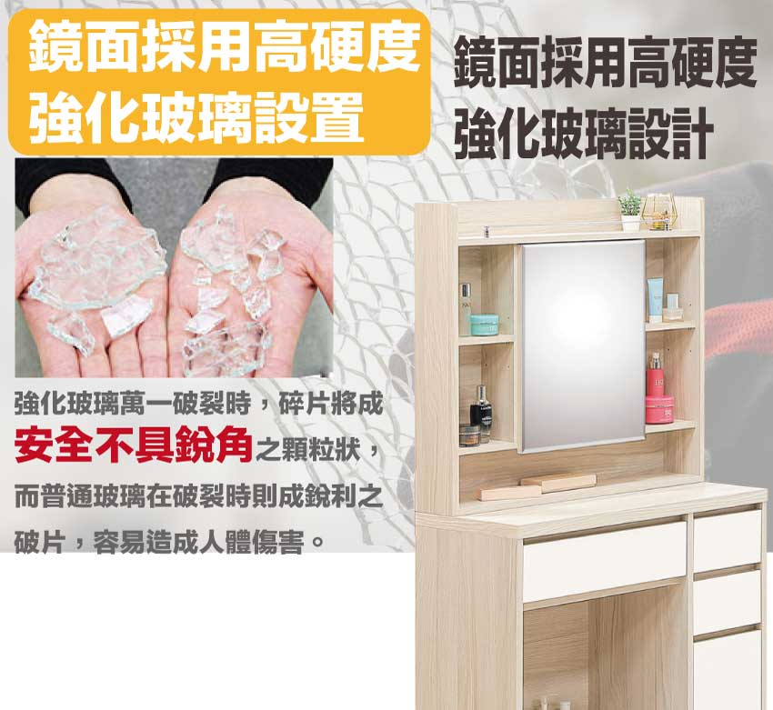 材質:防蛀木心板+五金滑軌結構+強化玻璃鏡面+防潮耐磨底座