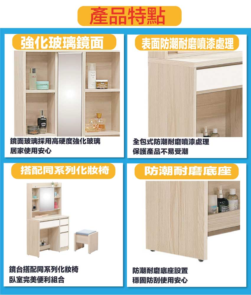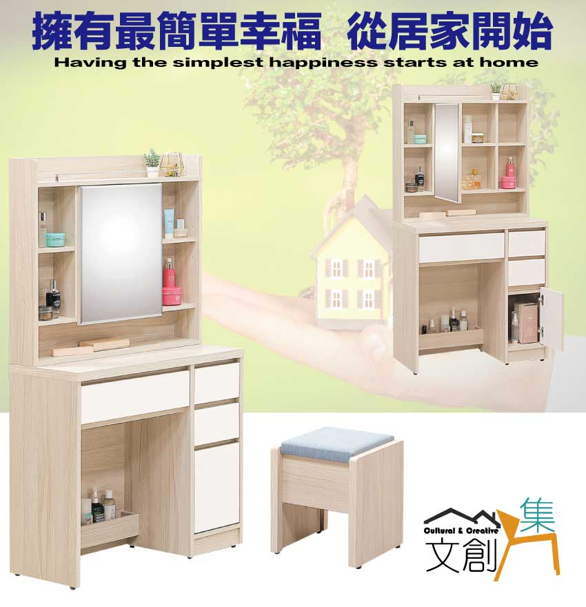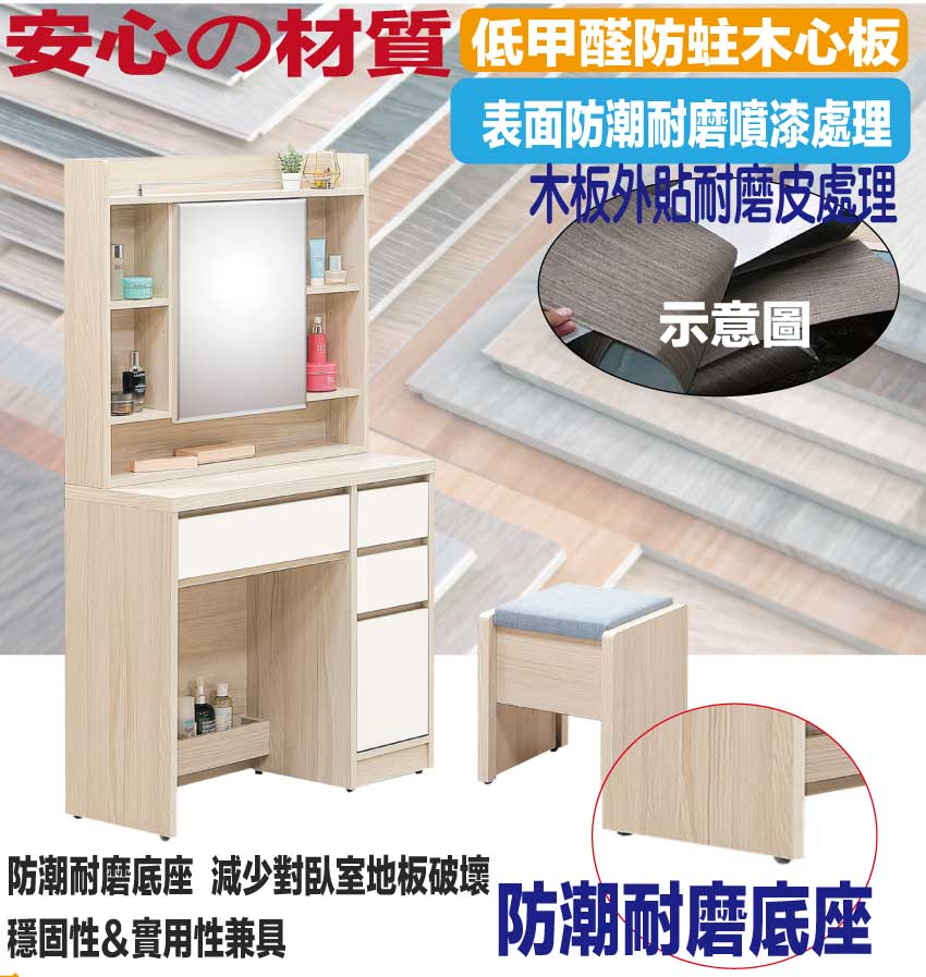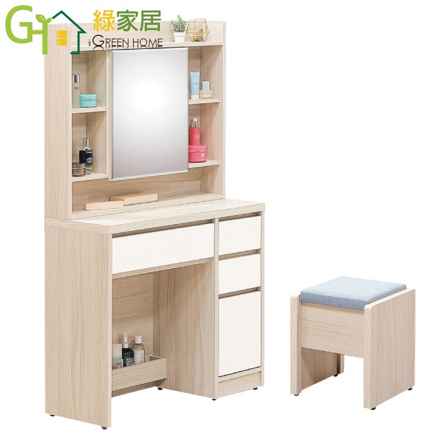 【綠家居】山多利雙色2.7尺開合鏡面鏡台/化妝台組合(含化妝椅) 木紋雙色系+安心材質製造,使用放心+搭配居家更便利,採用防蛀木心板+五金滑軌結構+強化玻璃鏡面+防潮耐磨底座等安心材質製造 ,外層採用防潮耐磨噴漆處理搭配採用開合鏡面櫃+開門櫃+三抽屜+內&外開放層格等收納空間設計,全由專人配送到家,專業安心服務,替你省下更多時間!