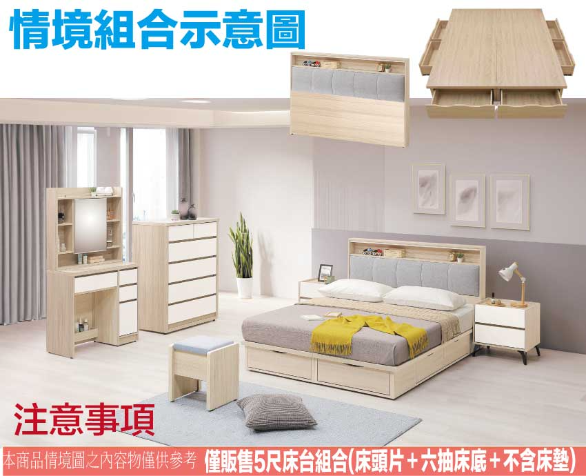 搭配床頭開放收納層格加床底座三邊開合六抽屜等收納空間設計