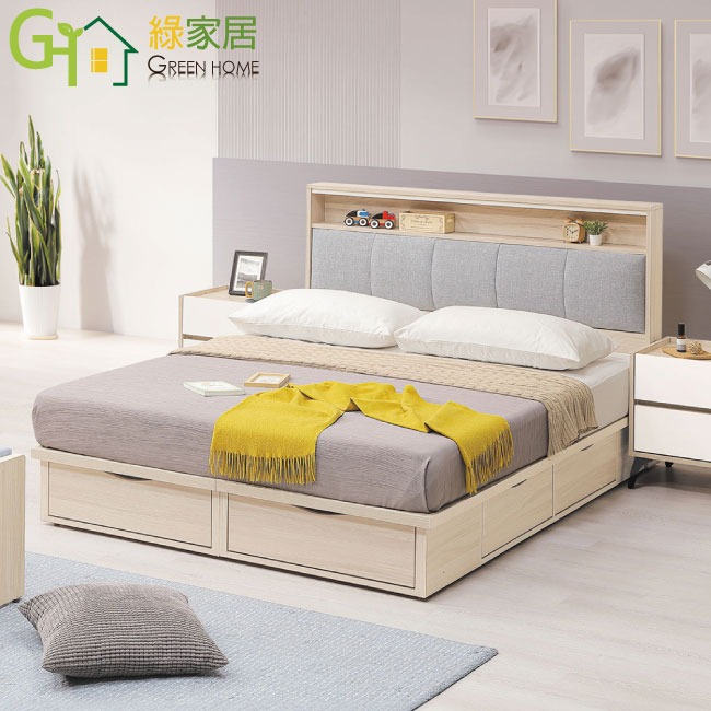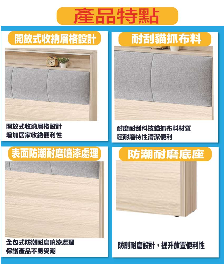 【綠家居】山多利貓抓布5尺雙人六抽床台組合(床頭片+六抽床底+不含床墊) 橡木紋色系+安心材質製造,使用放心+搭配居家更便利,採用防蛀木心板+防潮耐磨底座+六分木床底+耐磨貓抓布+高彈力泡棉等安心材質製造 ,外層採用防潮耐磨噴漆處理搭配床頭開放收納層格加床底座三邊開合六抽屜等收納空間設計,全由專人配送到家,專業安心服務,替你省下更多時間!