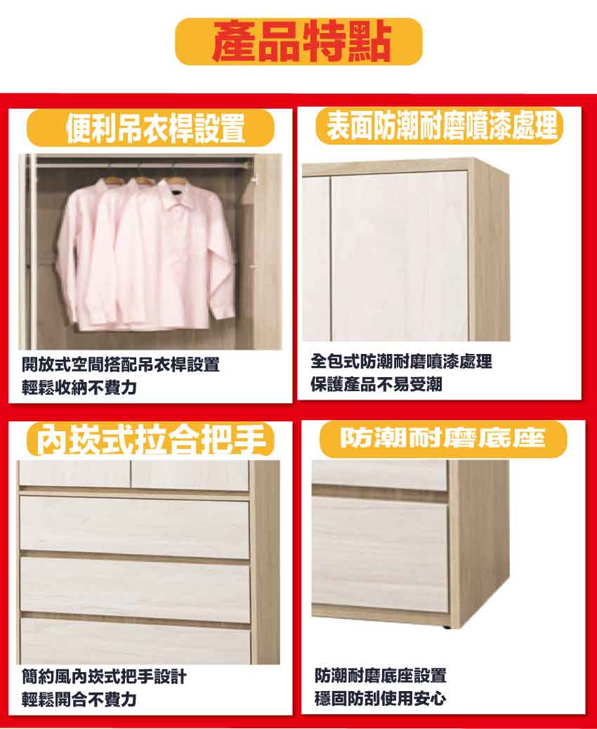 採用防蛀木心板+防潮耐磨底座+五金滑軌結構+防夾手緩衝五金等安心材質製造