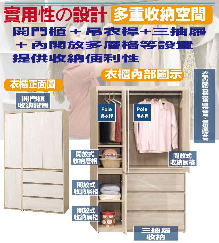 搭配採用開門櫃+吊衣桿+三抽屜+內開放式層格等收納空間設計
