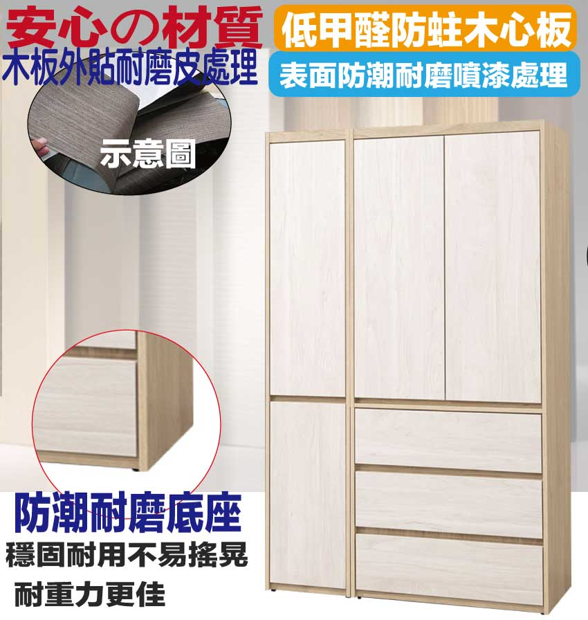 【綠家居】雷克利4尺四門三抽雙色衣櫃 木紋雙色系+安心材質製造,使用放心+搭配居家更便利,採用防蛀木心板+防潮耐磨底座+五金滑軌結構+防夾手緩衝五金等安心材質製造 ,外層採用防潮耐磨噴漆處理搭配採用開門櫃+吊衣桿+三抽屜+內開放式層格等收納空間設計,全由專人配送到家,專業安心服務,替你省下更多時間!