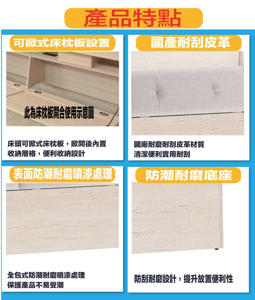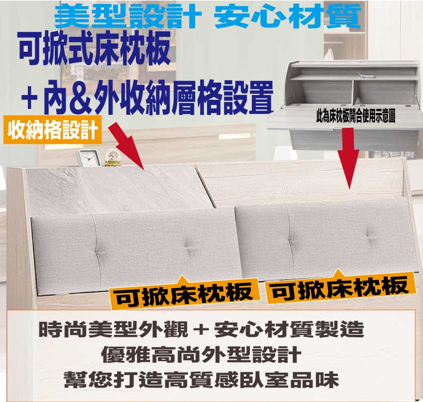 搭配床頭可掀式床枕板+內&外開放層格等收納空間設計