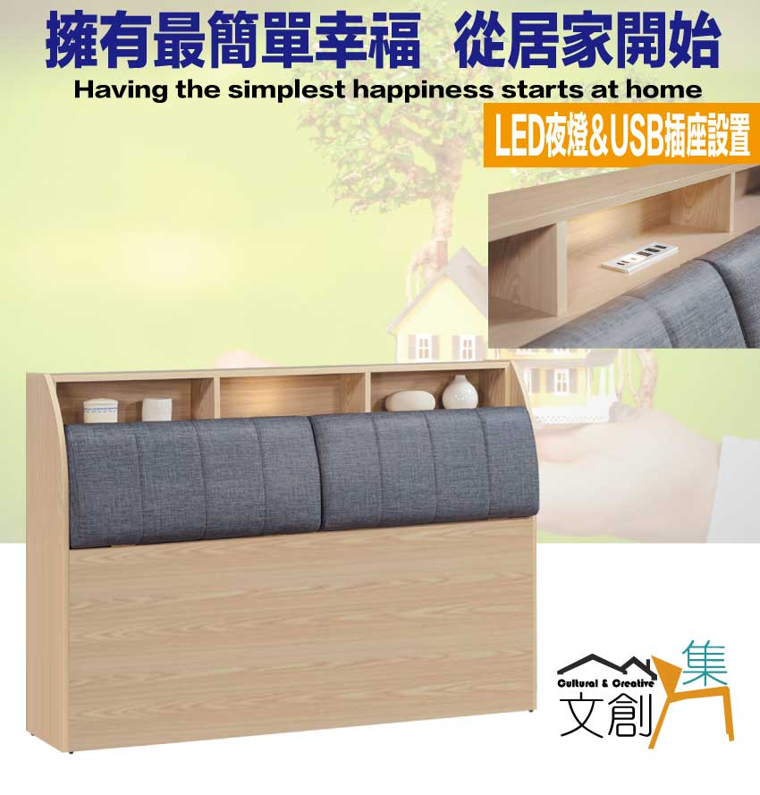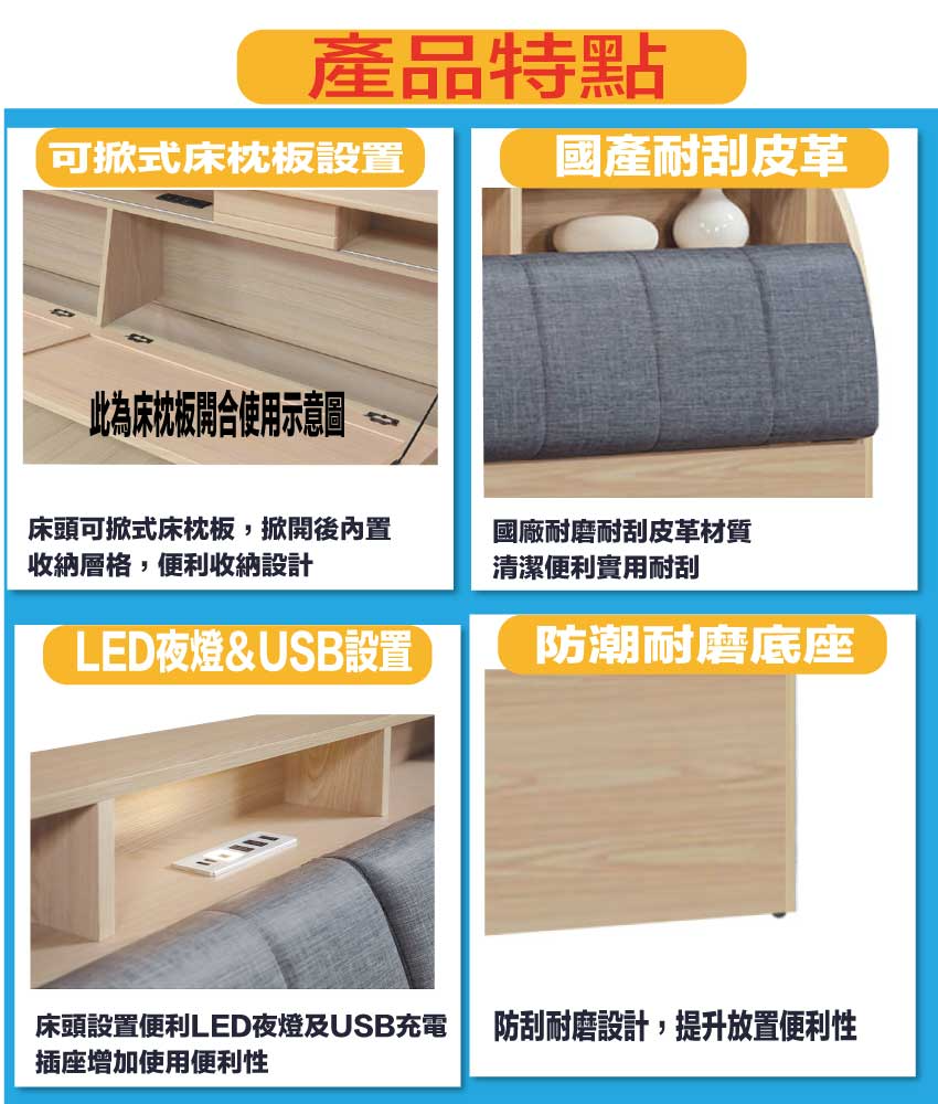 搭配床頭可掀式床枕板+內&外開放層格+LED夜燈&USB插座設置等收納空間設計