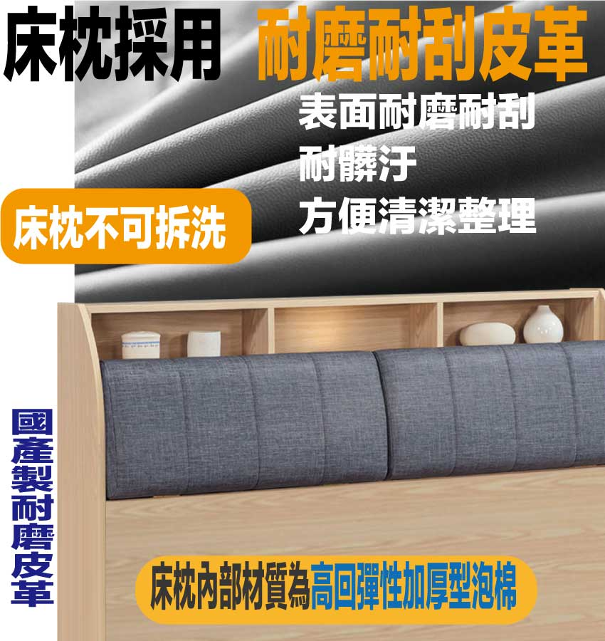 材質:防蛀木心板+防潮耐磨底座+耐磨耐刮皮革+高彈力泡棉