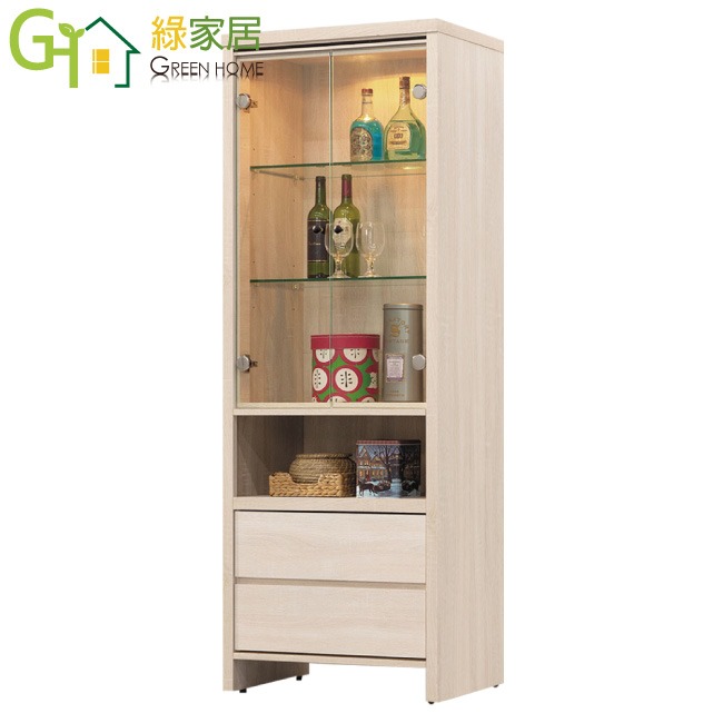 【綠家居】美尼利2.2尺二門二抽展示櫃(內置LED氛圍燈) 木紋雙色系+安心材質製造,使用放心+搭配居家更便利,採用防蛀木心板+五金滑軌結構+防潮耐磨底座+防夾手緩衝門片五金+5mm強化玻璃門片+8mm玻璃層板等安心材質製造 ,外層採用防潮耐磨噴漆處理搭配採用開門櫃+二抽屜+開放層格等收納空間設計,全由專人配送到家,專業安心服務,替你省下更多時間!