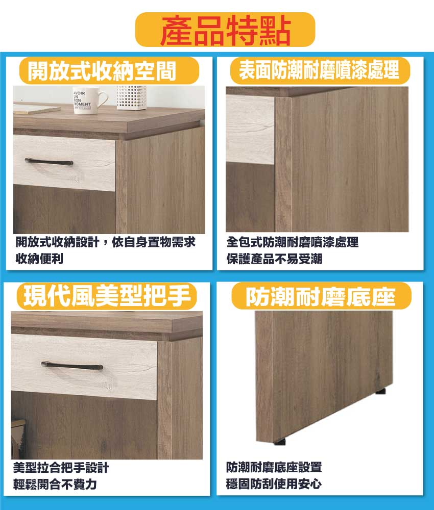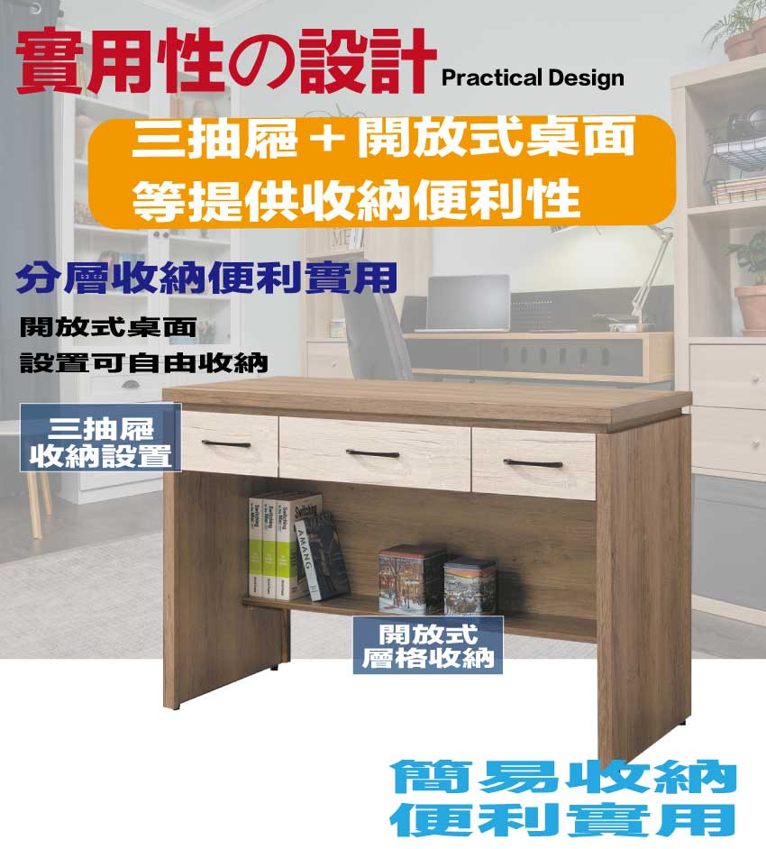 搭配採用三抽屜+開放桌面等收納空間設計