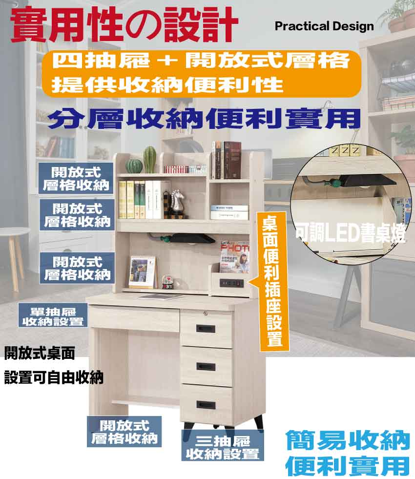 搭配採用四抽屜+開放多層格+可調書桌燈+便利插座設置等收納空間設計