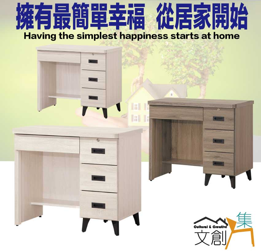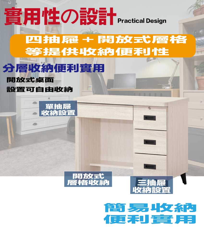 搭配採用四抽屜+開放桌面等收納空間設計