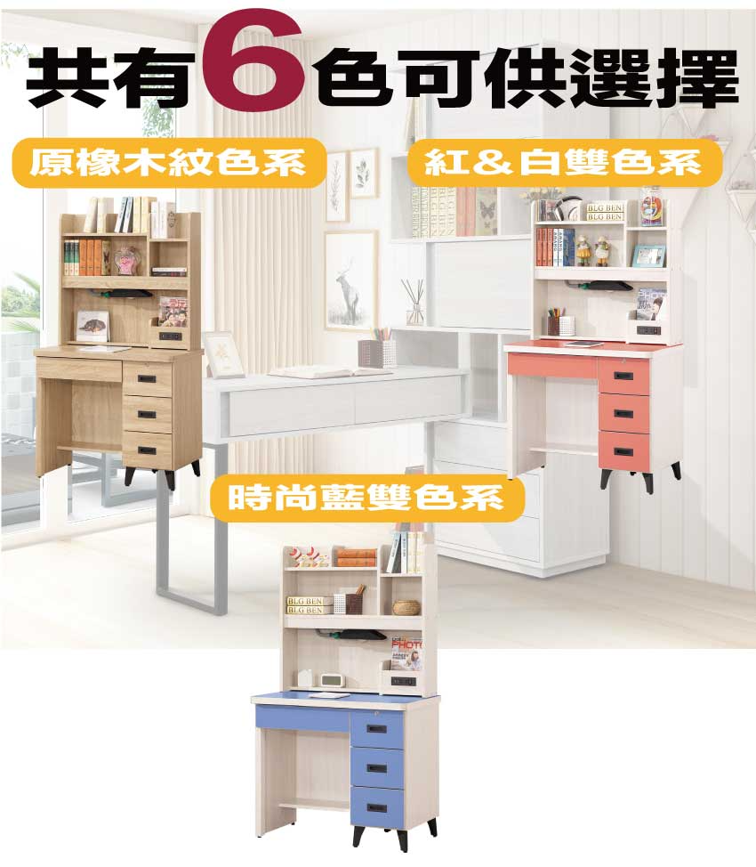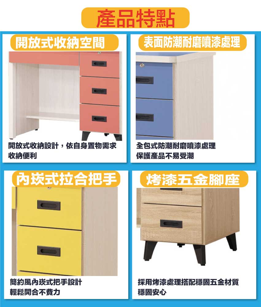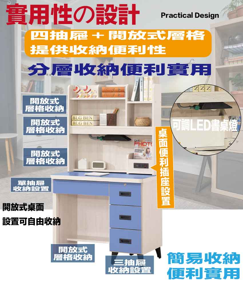 搭配採用四抽屜+開放多層格+可調書桌燈+便利插座設置等收納空間設計