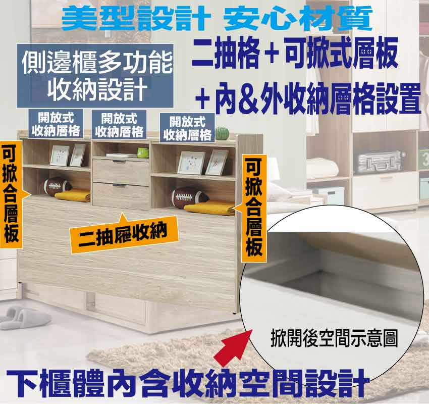 搭配可掀式底板+二抽屜+內&外開放層格等收納空間設計