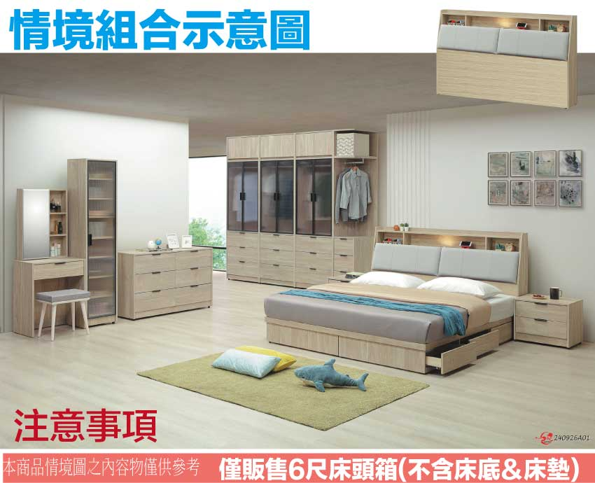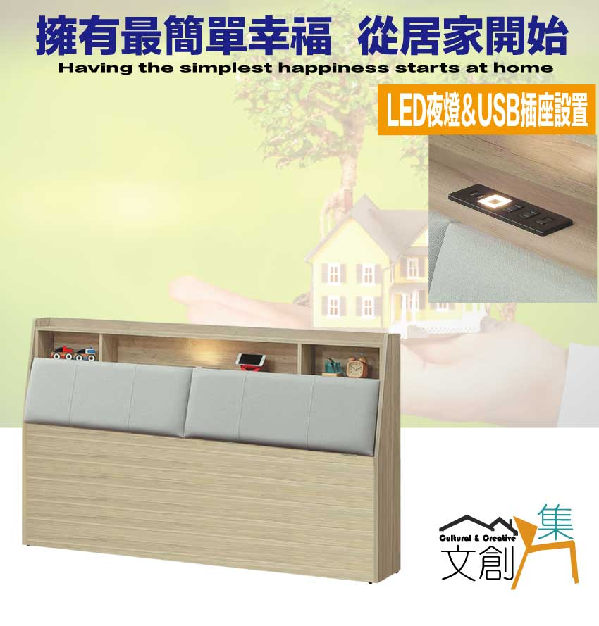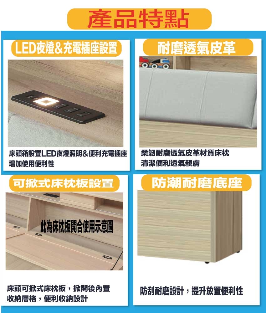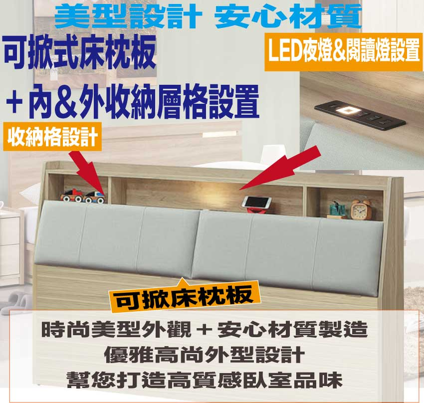 搭配床頭可掀式床枕板+內&外開放層格+LED夜燈設置等收納空間設計