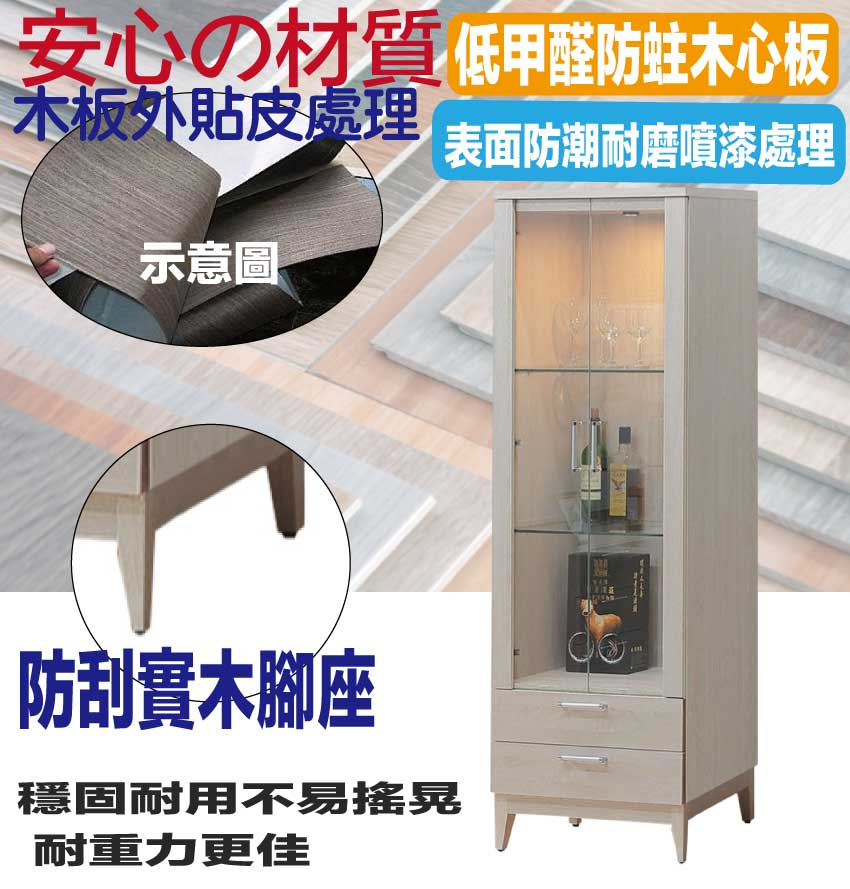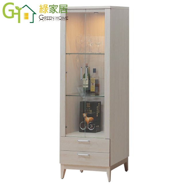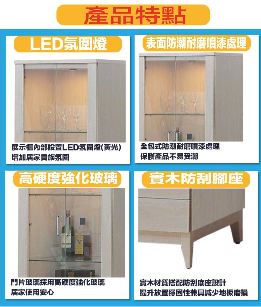 【綠家居】夏沐2尺二門二抽展示櫃 淺橡木紋色系+安心材質製造,使用放心+搭配居家更便利,採用防蛀木心板+實木防刮腳座+五金滑軌結構+5mm強化玻璃&8mm強化玻璃層板等安心材質製造 ,外層採用防潮耐磨噴漆處理搭配採用開門櫃+二抽屜+內開放層格+內附LED氛圍燈等收納空間設計,全由專人配送到家,專業安心服務,替你省下更多時間!