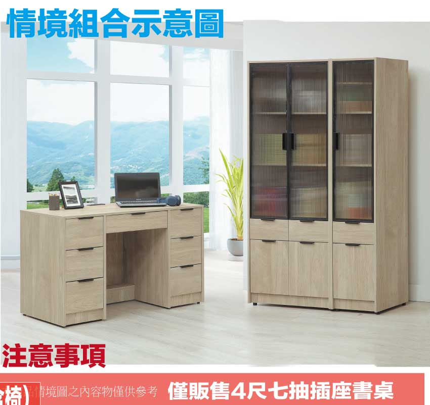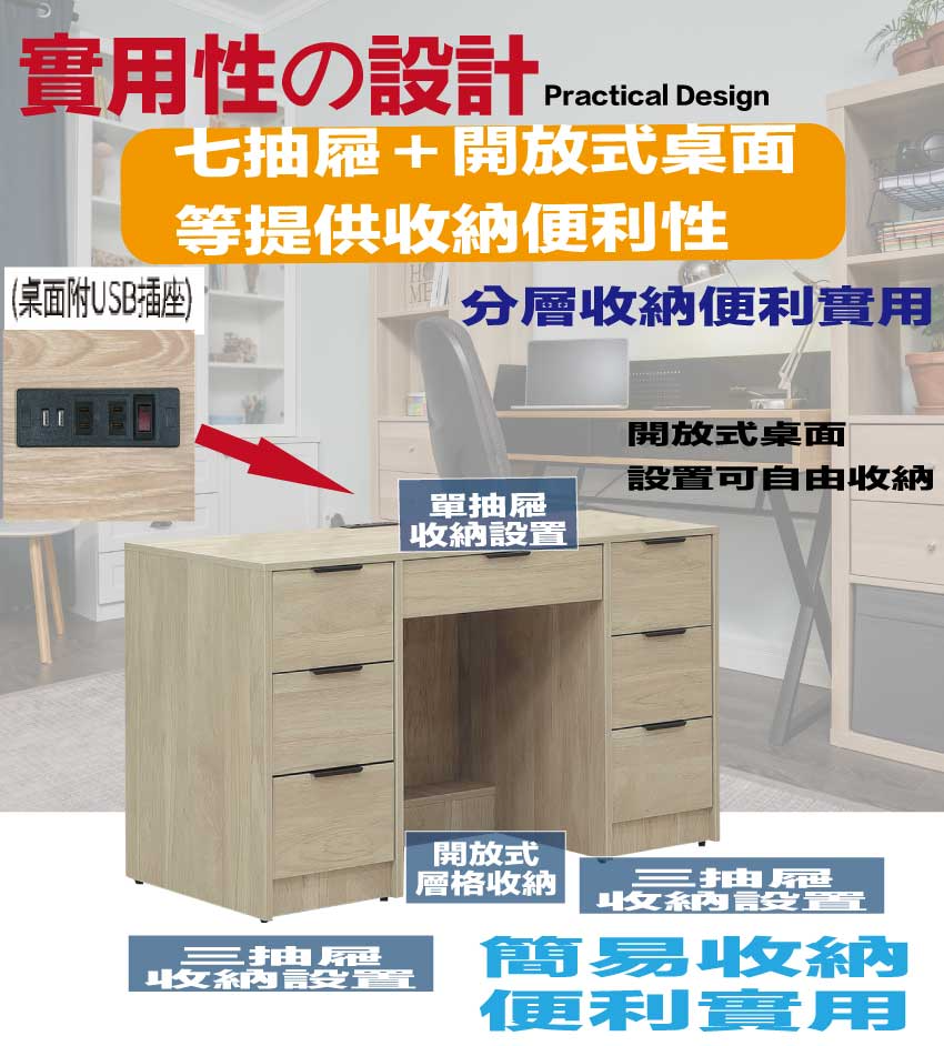 - ◆產品名稱:【綠家居】畢克爾4尺七抽書桌(桌面插座設置)