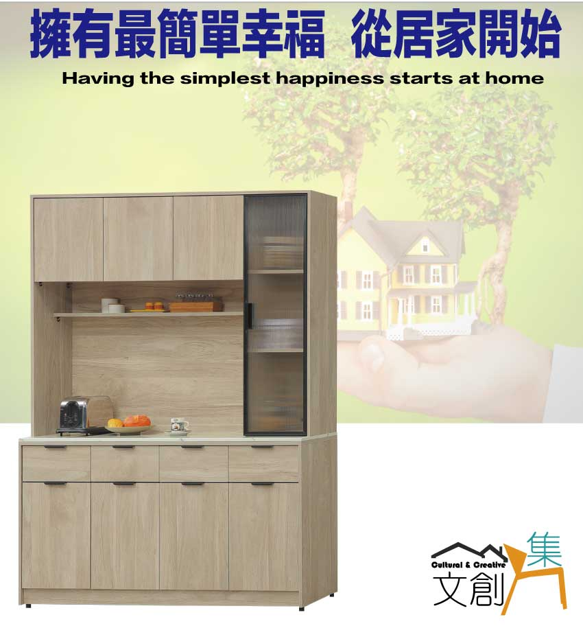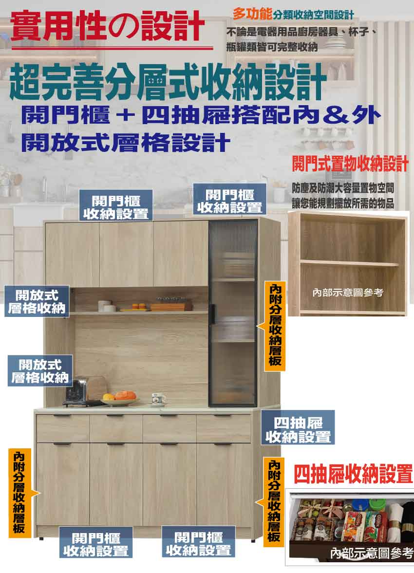 搭配採用開門櫃+四抽屜+內&外開放層格等收納空間設計