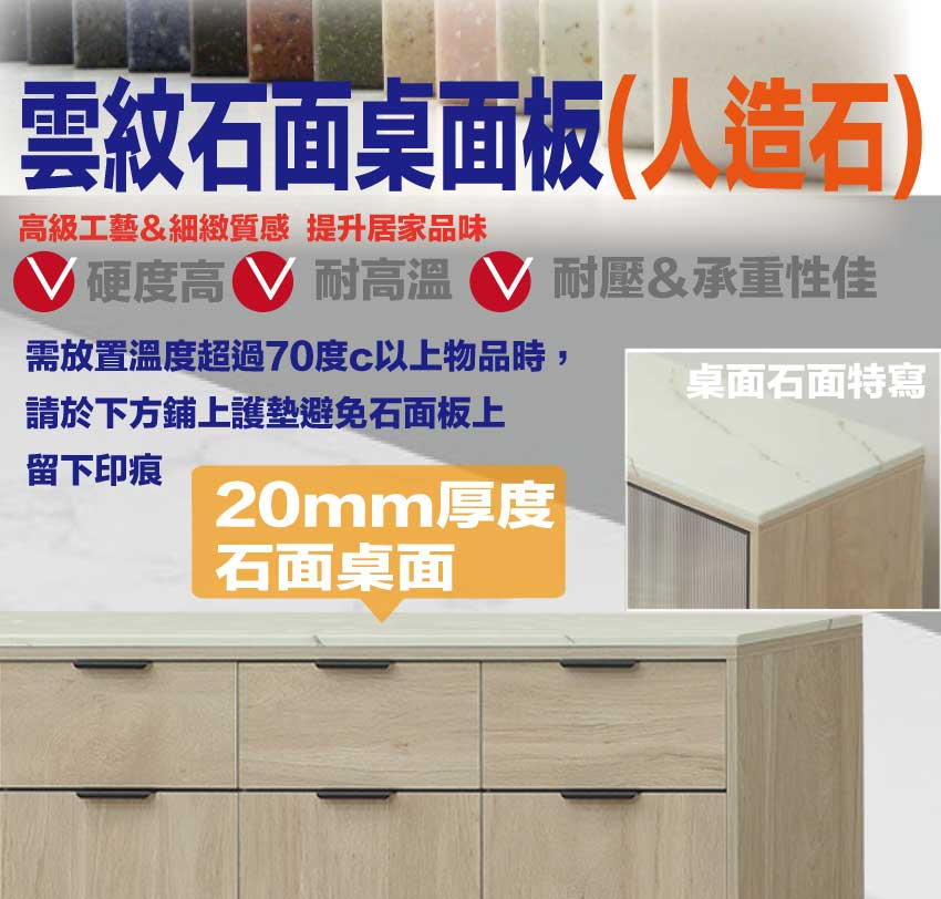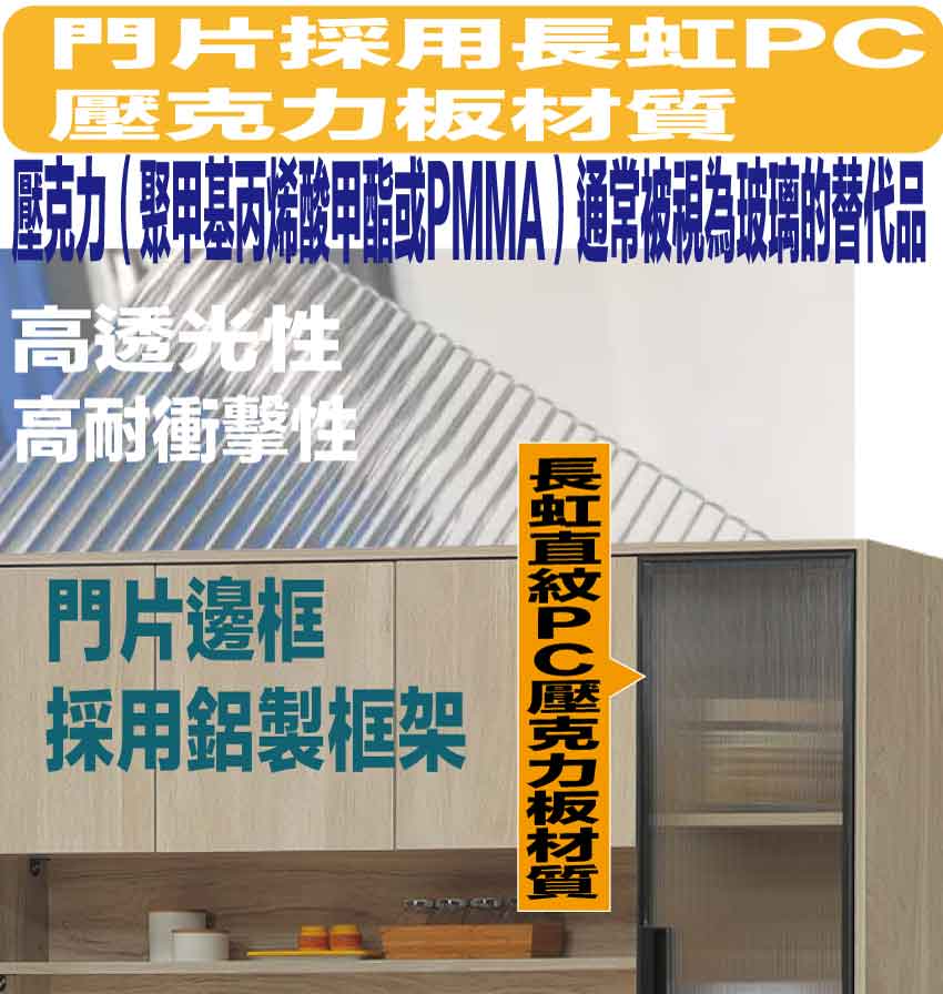 採用防蛀木心板+防潮耐磨底座+黑漆鋁製門框+長虹PC材質門片+防夾手緩衝門片五金+五金滑軌結構+20mm雲紋石面桌面板等安心材質製造