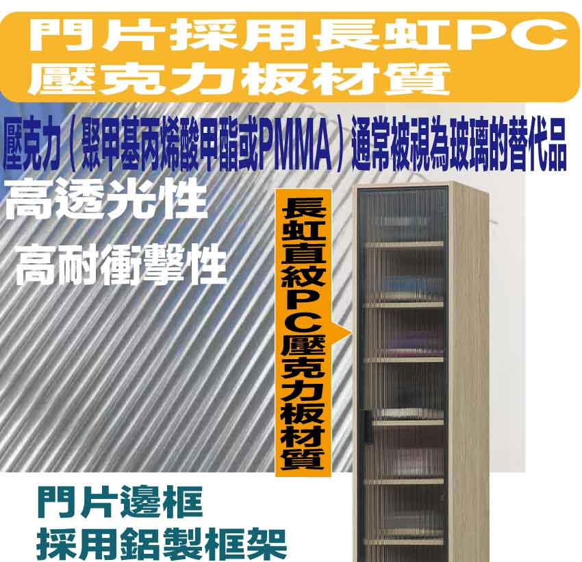 材質:防蛀木心板+防潮耐磨底座+黑漆鋁製門框+長虹PC材質門片+防夾手緩衝門片五金