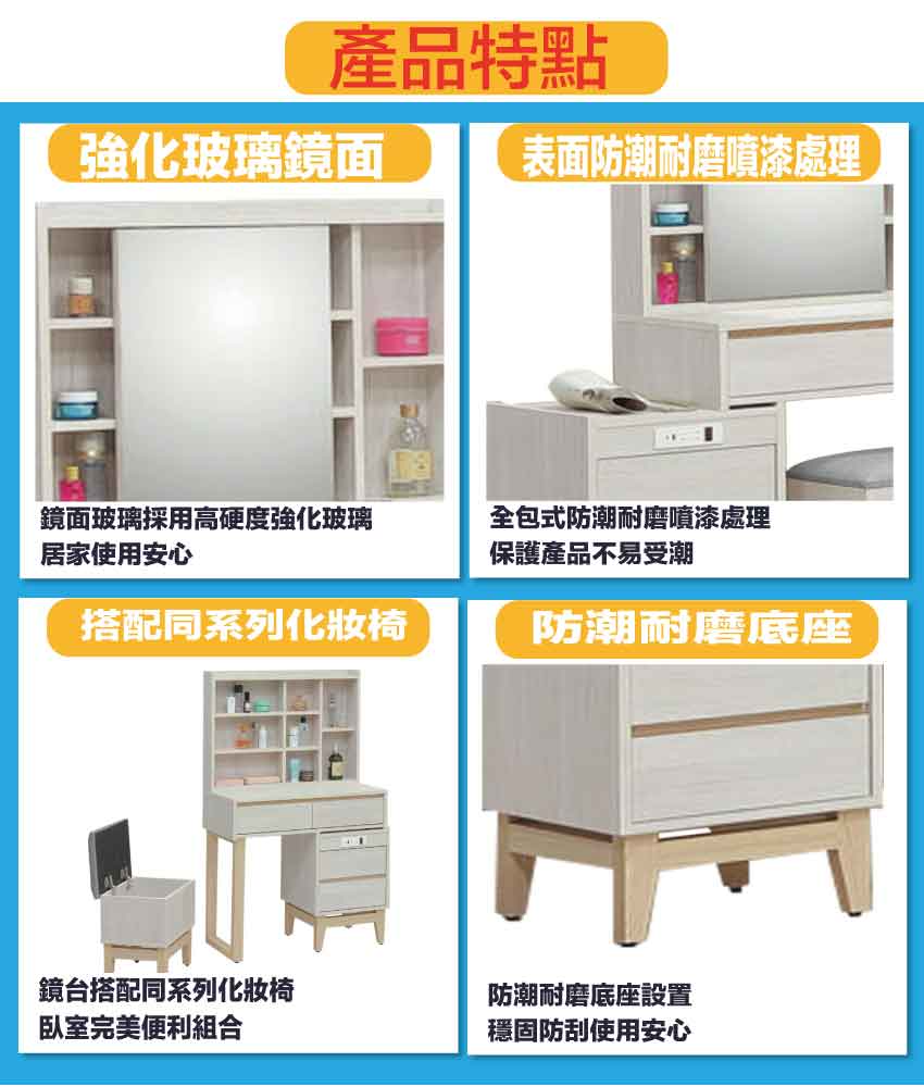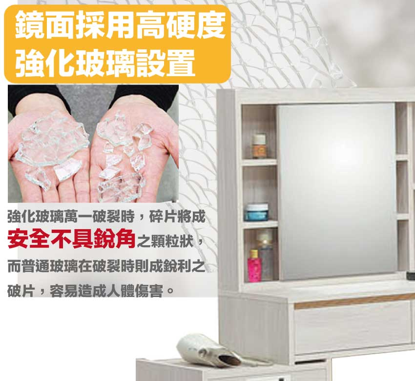 採用防蛀木心板+防潮耐磨底座+五金滑軌結構+強化玻璃鏡面等安心材質製造