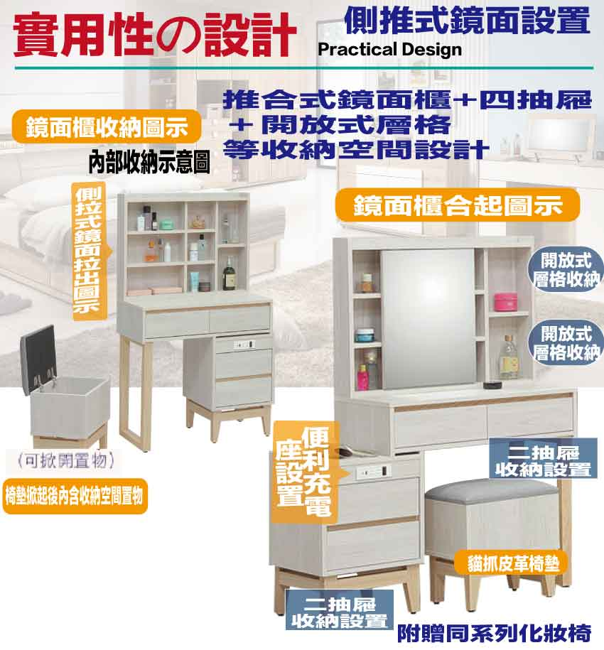 材質:防蛀木心板+防潮耐磨底座+五金滑軌結構+強化玻璃鏡面+貓抓皮革椅墊+高彈力泡棉