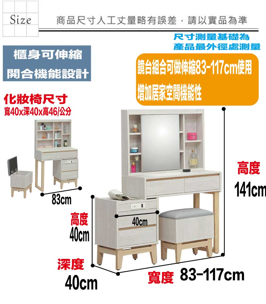 此化妝台桌面&櫃身部分可作伸縮83-117cm寬度使用增加居家便利性