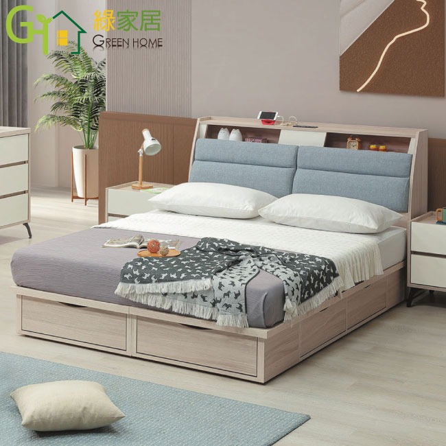 【綠家居】美斯5尺雙人貓抓布六抽床台組合(床頭箱+六抽床底+不含床墊) 橡木紋色系+安心材質製造,使用放心+搭配居家更便利,採用防蛀木心板+防潮耐磨底座+耐刮貓抓布+高回彈泡棉等安心材質製造 ,外層採用防潮耐磨噴漆處理搭配床頭箱可掀式床枕板+內&外收納層格+便利插座設置+床底座三邊開合六抽屜等收納空間設計,全由專人配送到家,專業安心服務,替你省下更多時間!
