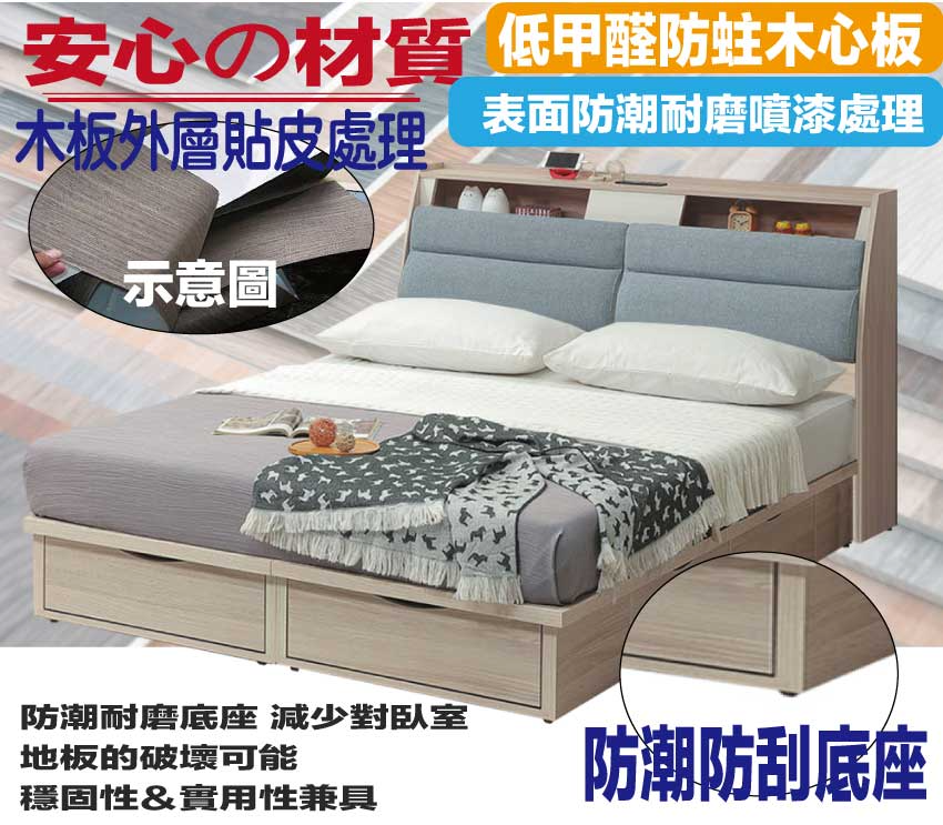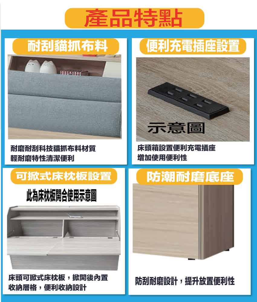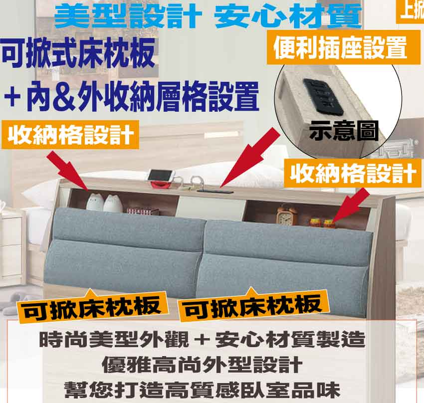 搭配床頭箱可掀式床枕板+內&外收納層格+便利插座設置+床底座三邊開合六抽屜等收納空間設計