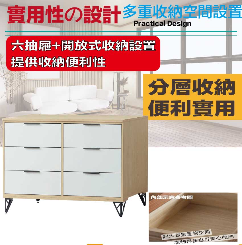 搭配採用六抽屜+開放層格等收納空間設計