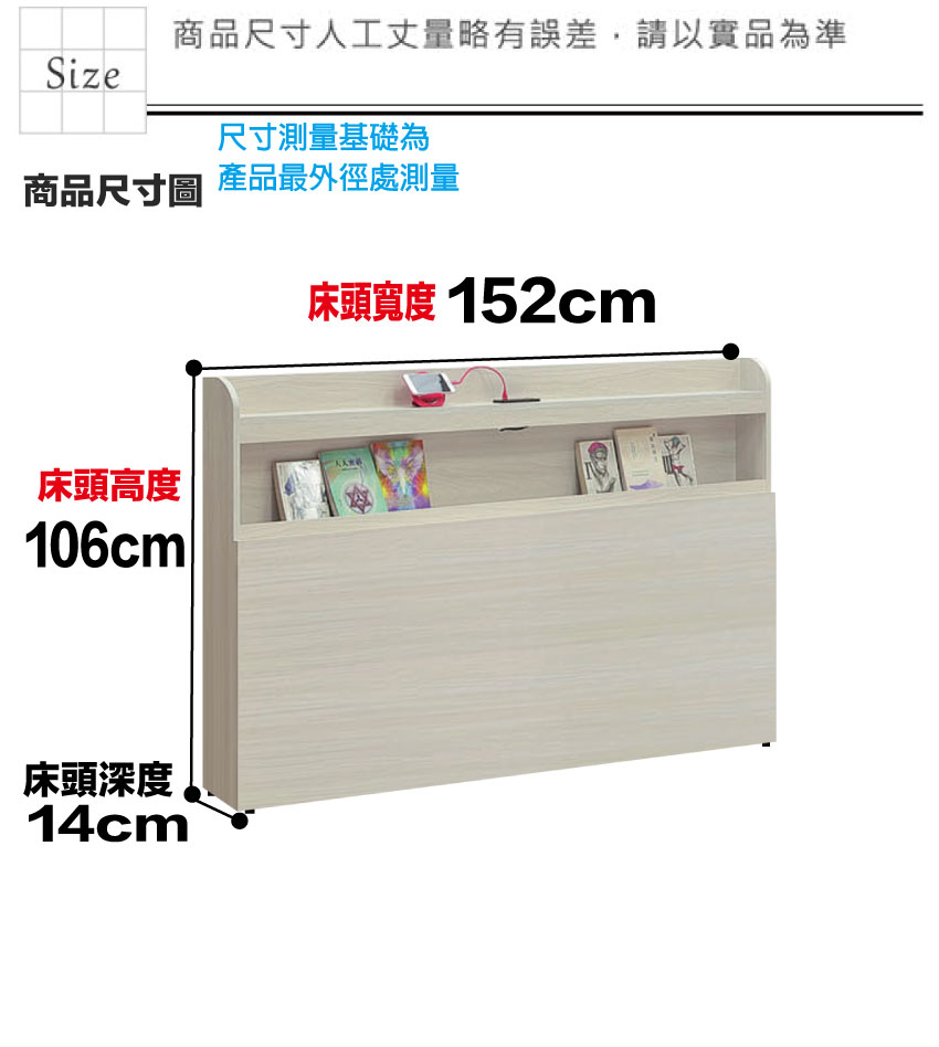 床頭尺寸:(寬)152x(深)14x(高)106/公分