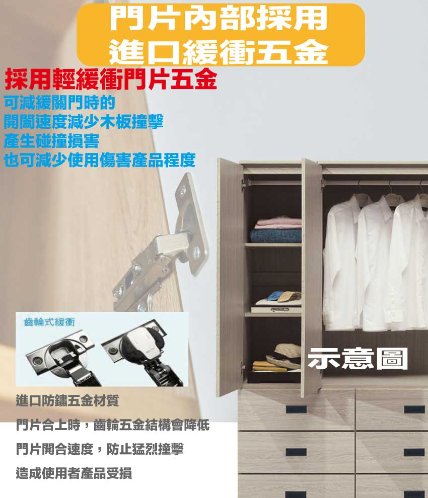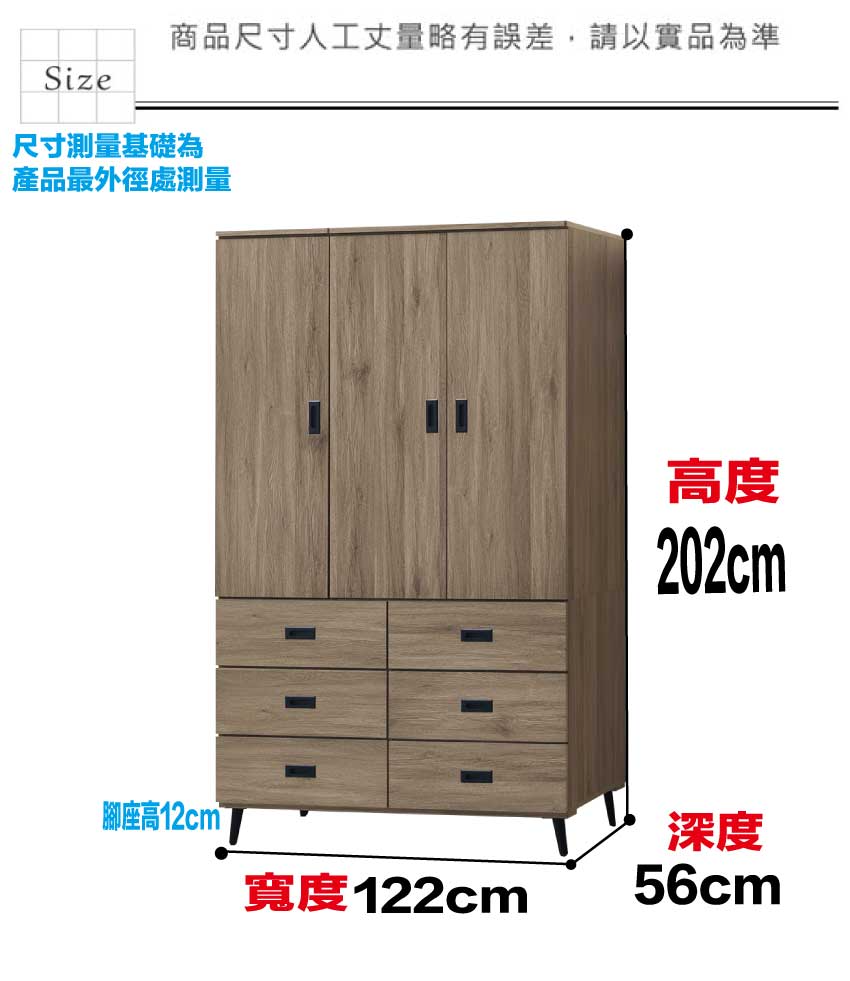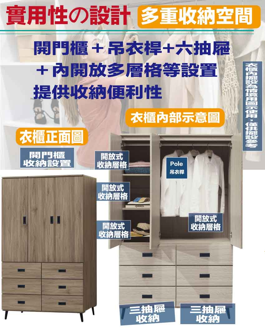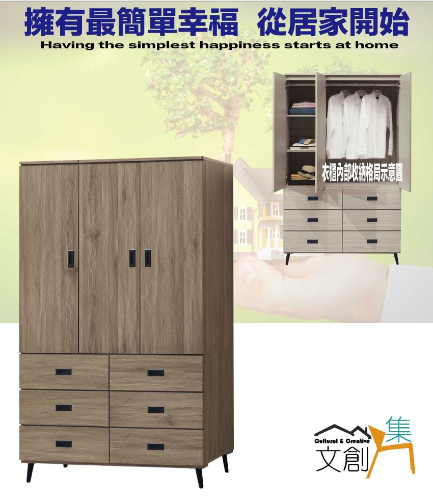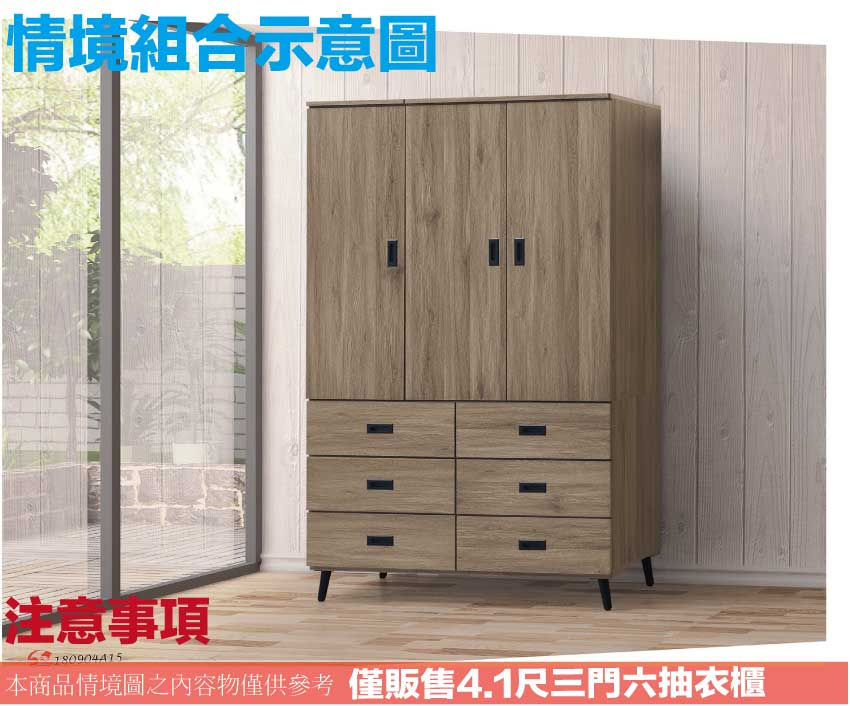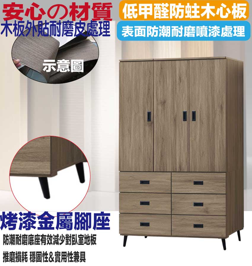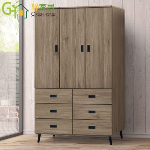 - ◆產品名稱:【綠家居】格斯灰橡4.1尺三門六抽衣櫃